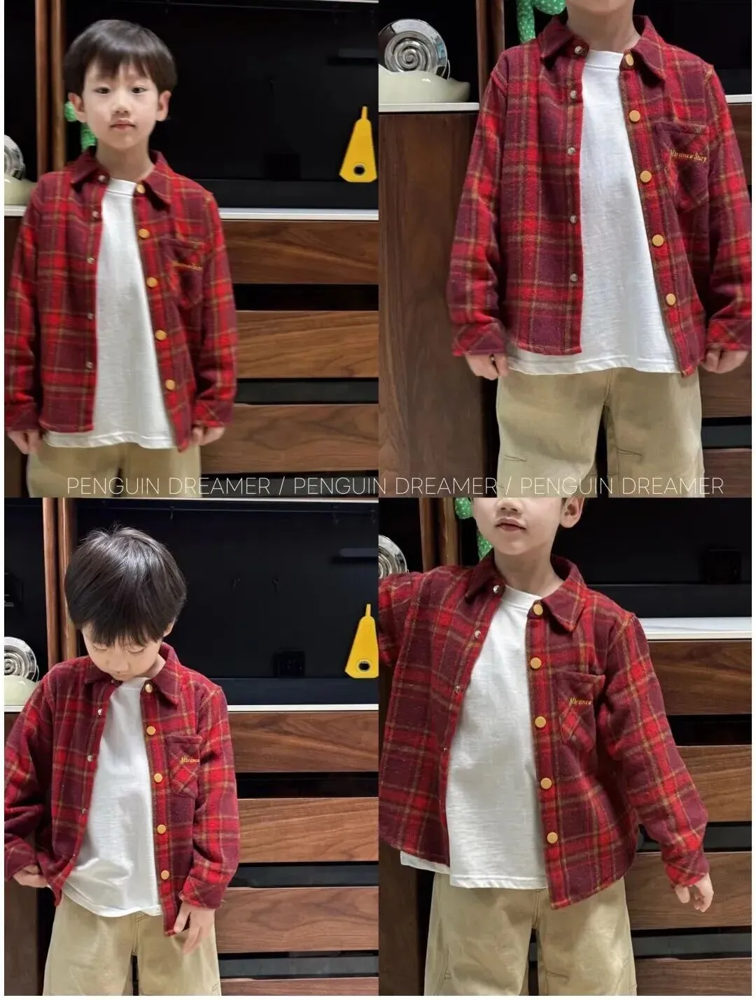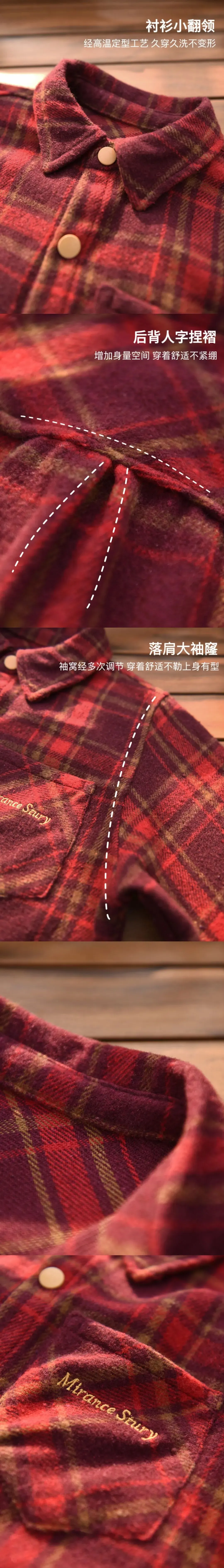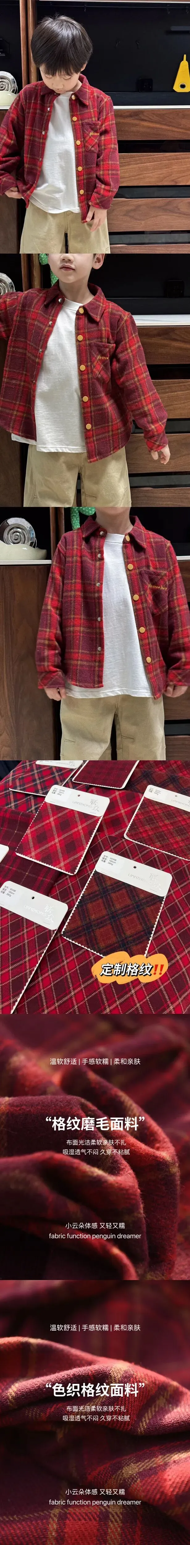 面料是有厚度的磨毛材质,表面松软,反面质地舒滑,做内搭真的超绝,既不厚重还能穿出层次感。经特殊缩绒起毛整理工艺,纱线紧密排列,手感软软糯糯。做工一定要强调一下!纯正统的衬衫做工,任何一个地方的拼合都不会有缝头外露,都是给包裹在里头的,整件衣服盯着看眼花缭乱的,但是仔细看能看到咱们很多拼合的走线,内部都是比普通的针线要粗很多的,很有质感。定织定染的红咖多纱格纹交叠,娃上身太有年味了~