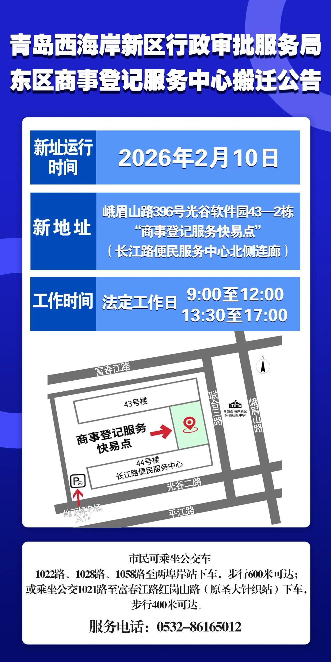 2026年2月7日、8日(星期六、星期日),青岛西海岸新区行政审批服务局东区商事登记服务中心搬迁。