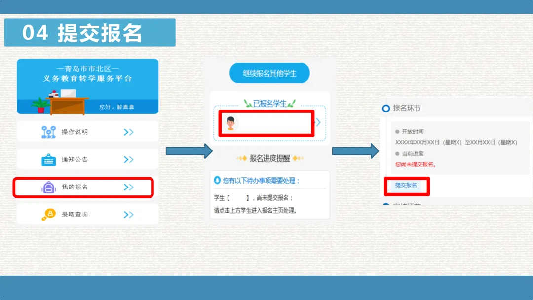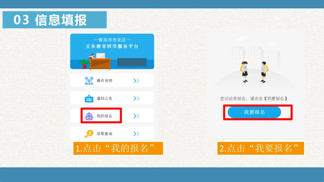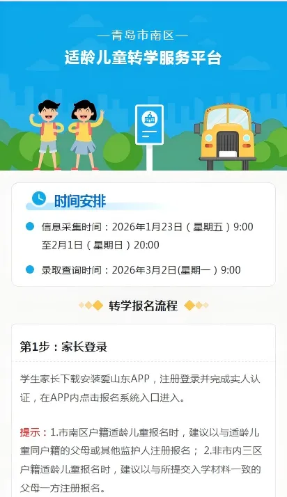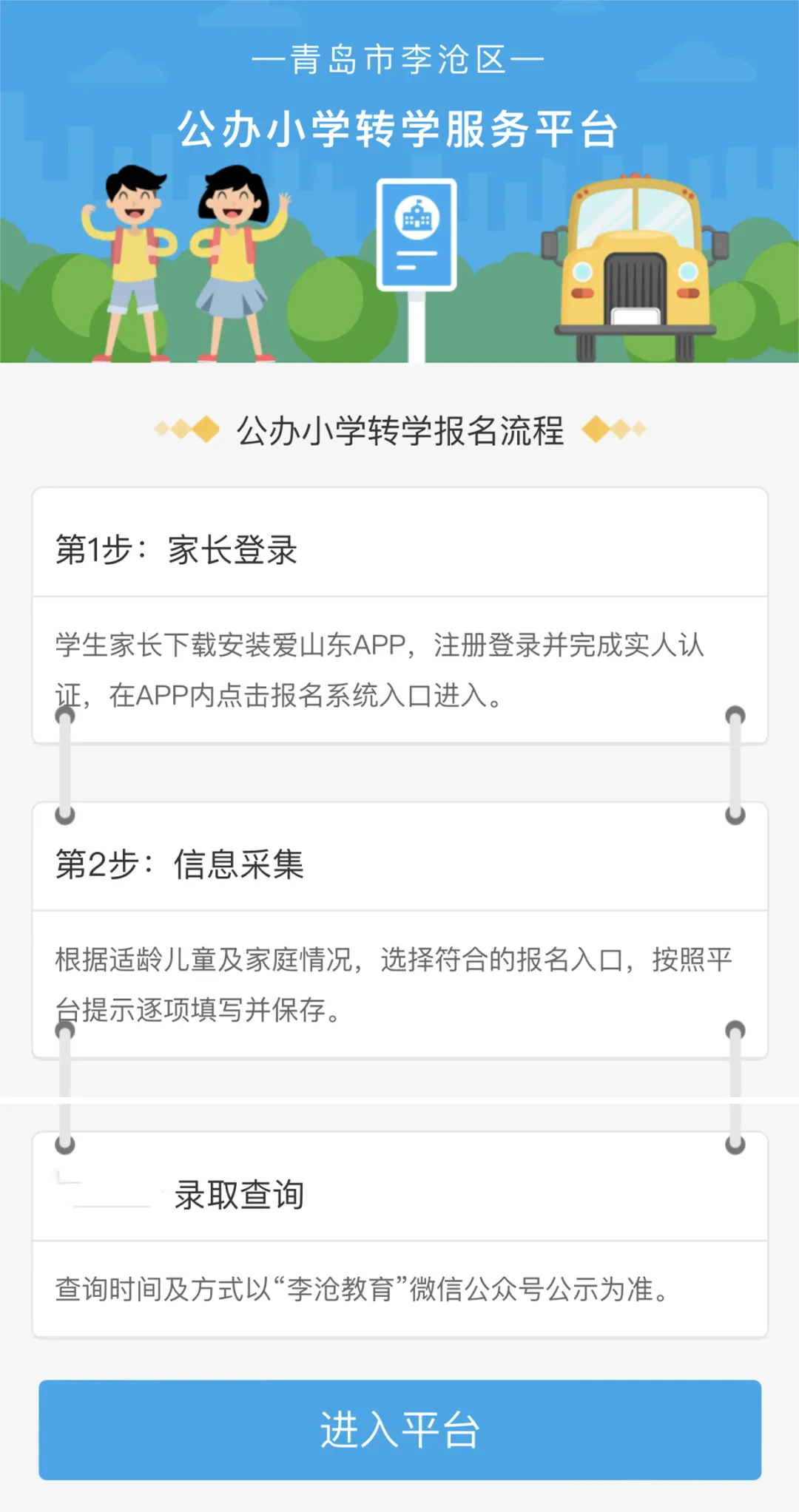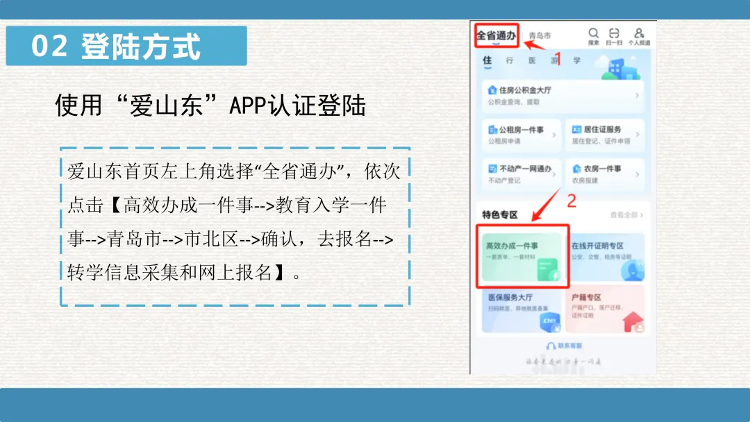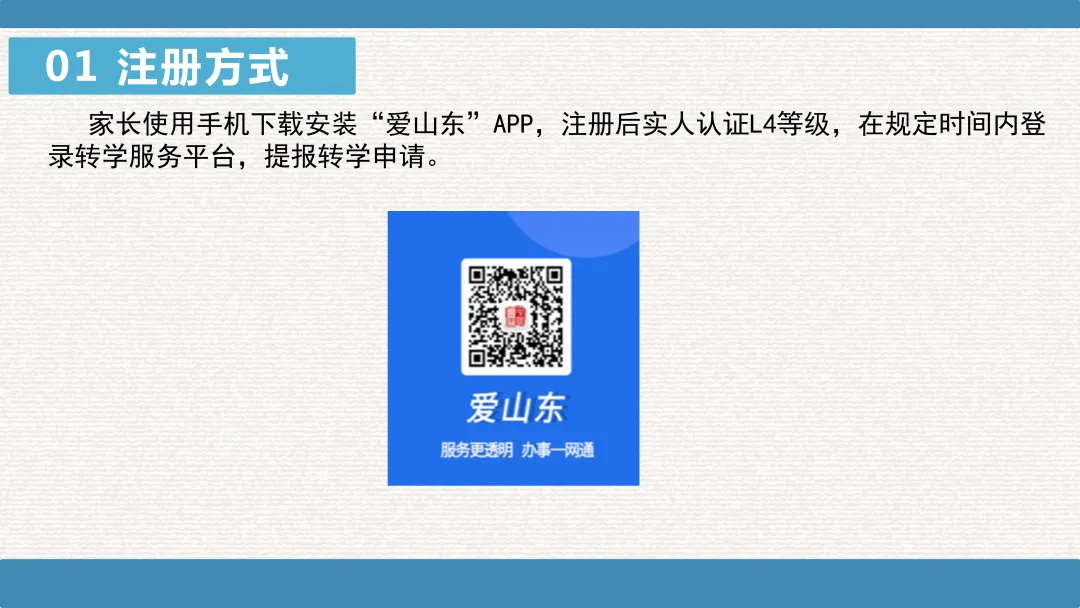 家长需通过手机端下载安装“爱山东”APP,注册登录完成L4等级实人认证后,在APP内进入“市北区义务教育转学服务平台”进行网上报名(具体填报流程可参照填报指南)。