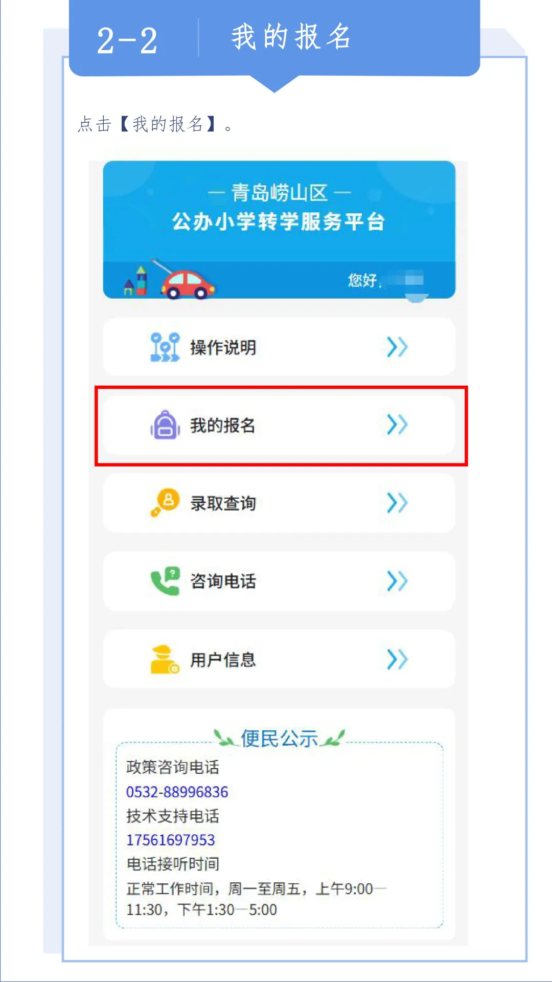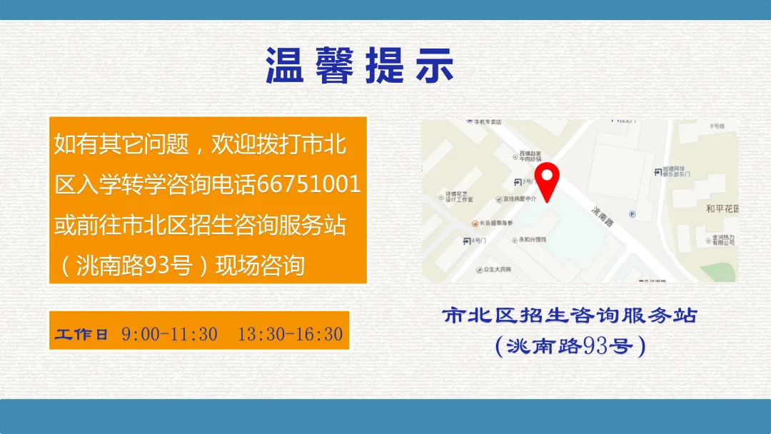 3.为更好地服务家长,即日起至2月5日位于市北区洮南路93号的“市北区中小学生招生咨询服务站”继续提供现场咨询服务。家长也可在工作时间拨打市北区招生服务咨询电话66751001进行咨询。