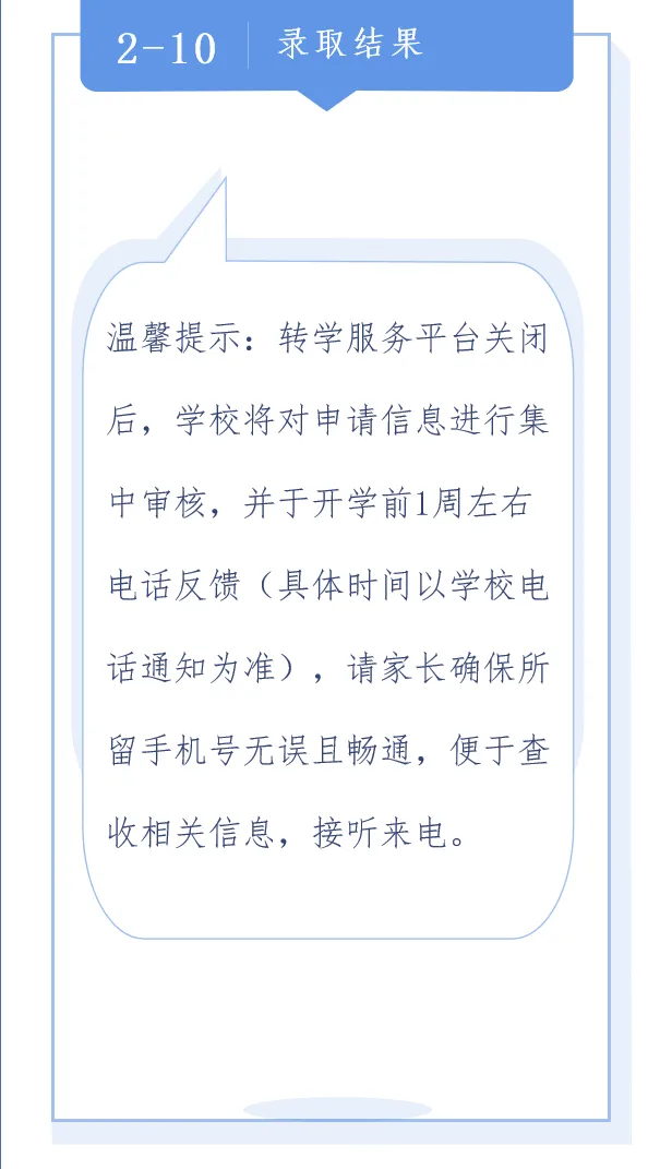 2026年3月2日(星期一)上午9:00至下午5:00,家长登录平台,查询转学安置结果,请家长确保信息填报中的手机信息准确无误。