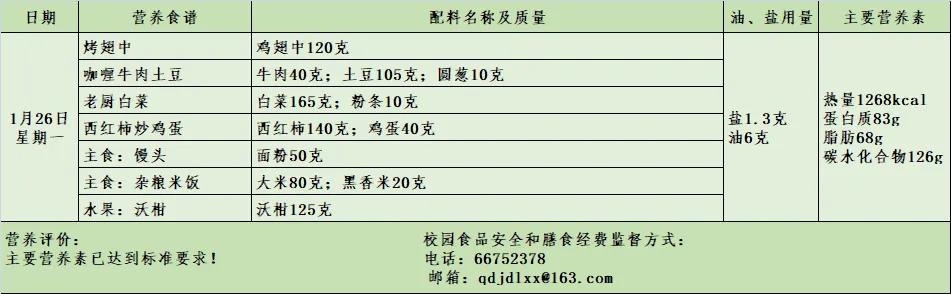 青岛二中附属实验学校一周食谱(1月26日--1月27日)