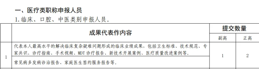 《标准条件》明确要求 “解决临床复杂疑难问题”,成果类型涵盖卫生标准、手术视频、MDT 多学科诊疗报告等;并为副高、正高分别设定1项、2项量化指标,还新增常见病多发病诊治报告、家庭医生签约服务报告,凸显对基层医疗卫生服务的重视。