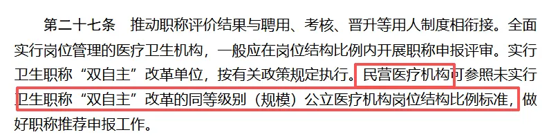 民营医疗机构可参照未实行卫生职称“双自主”改革的同等级别(规模)公立医疗机构岗位结构比例标准,做好职称推荐申报工作。民营医院医护人员的晋升也是有了政策背书,晋升的大门也是终于打开!