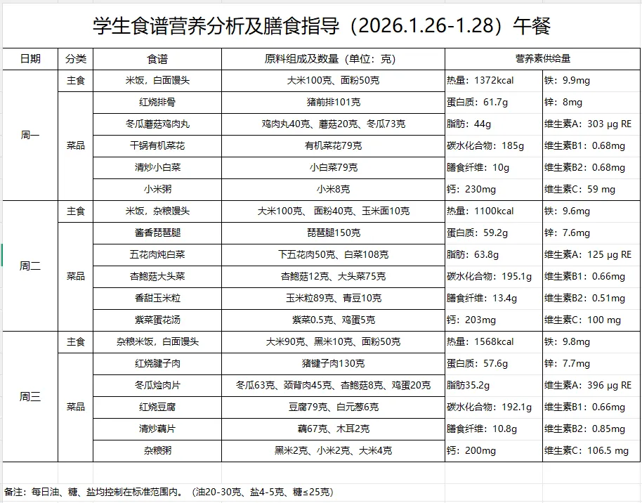 青岛五十八中附属初中一周食谱(1.26-1.28)