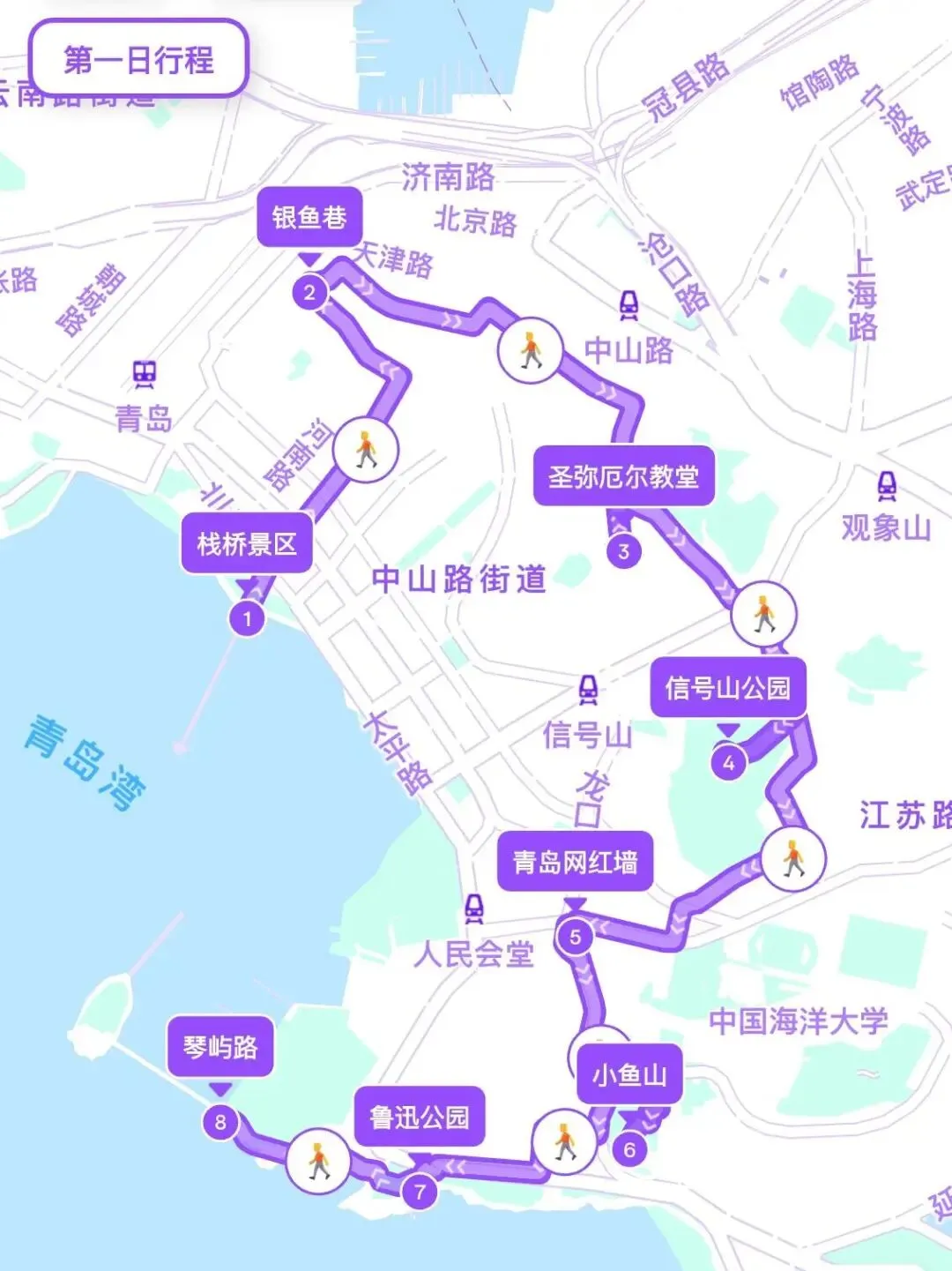 路线:栈桥-银鱼巷-圣弥厄尔教堂-信号山-大学路网红墙-小鱼山-鲁迅公园-琴屿路 交通:以地铁3号线为主,老城景点间步行或骑行,沉浸式感受欧式老城氛围。