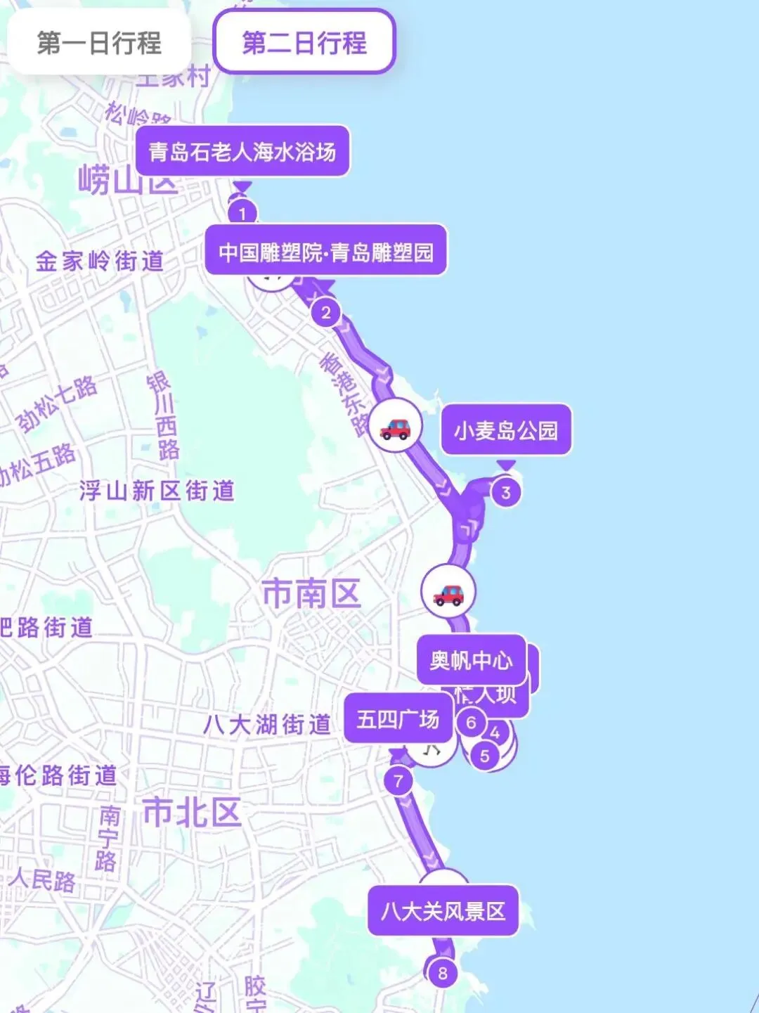 路线:石老人海水浴场-青岛雕塑园-小麦岛-燕儿岛-情人坝-奥帆中心-五四广场-八大关 交通:地铁2号线+打车+骑行,沿海路段骑行赏景超舒适。