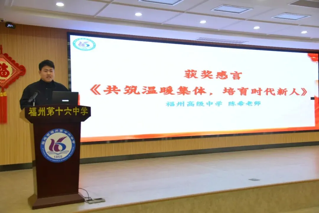 福州高级中学陈希老师作为获奖代表发言。他提出,通过“全员参与-全过程贯通-全方位覆盖”的育人路径,将温暖渗透于课堂内外、贯穿于成长全程,让每一次互动、每一份担当都成为滋养学生成长的温暖力量。他呼吁全体教育者从细节出发,共同构建让孩子获得归属感与价值感的育人共同体。