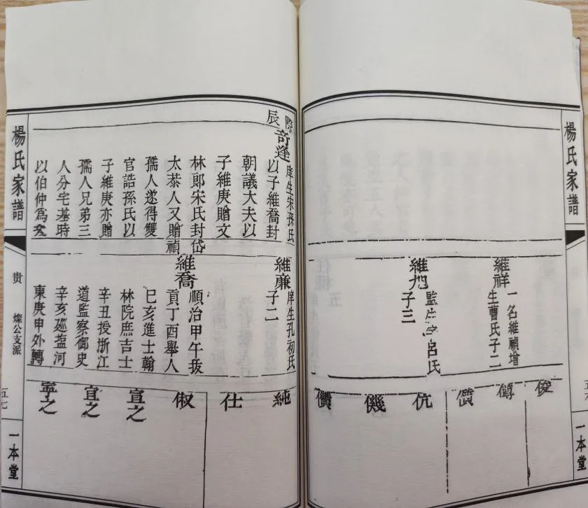 该谱凡例云:杨氏系山东登州府宁海州檠山社冶头村人,一世祖杨尖居冶村(今烟台莱山区解甲庄镇冶头村)。序云:杨尖生六子,其中杨贵和杨雄二祖为南北分宗之始……杨贵支系至六世杨燦(字经历)白手起家,任县丞再转卫幕,清初辞官回乡购置恒产,称其为杨贵支午台的开基祖。杨燦有四子:长子杨奇盛、次子杨奇茂、三子杨奇逢、四子杨奇遇,居于南塂,后世称为南塂老四支。其中,三支第八世杨维乔为杨氏代表人物之一。