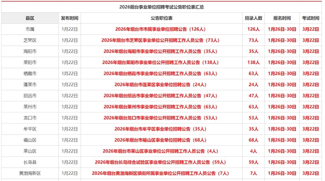 2026山东事业单位统考烟台市职位表汇总