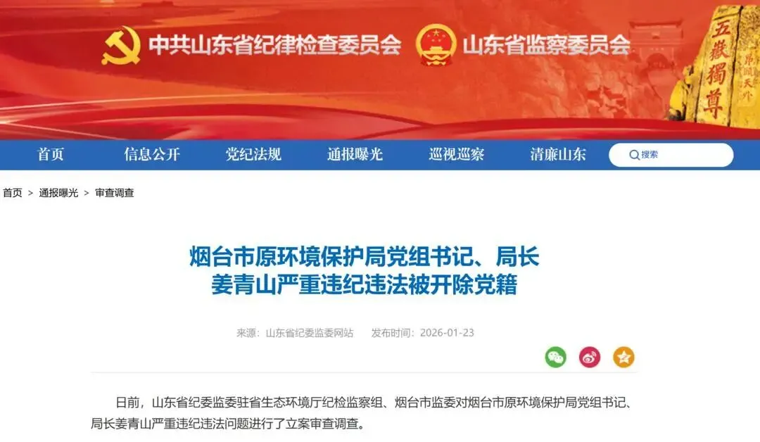 山东省纪委监委网站1月23日消息,烟台市原环境保护局党组书记、局长姜青山严重违纪违法被开除党籍。