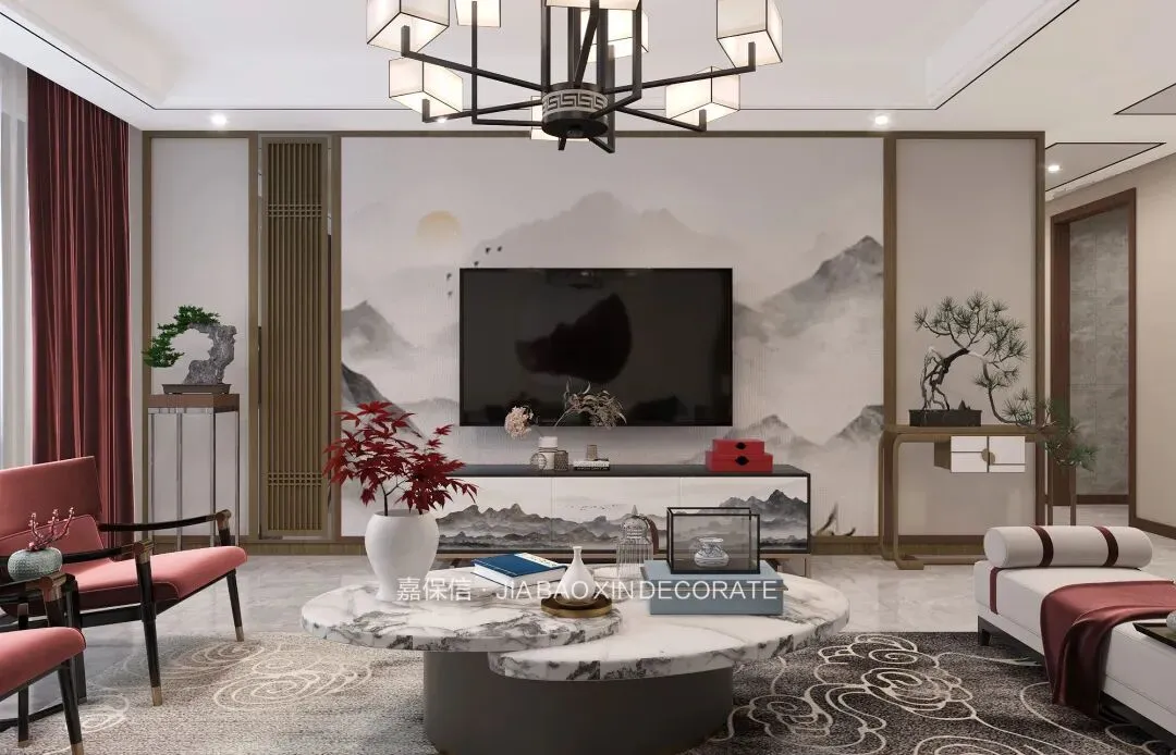 客厅里,水墨画般的背景墙衬着自然纹理的大理石茶几,意境悠远又安宁。电视墙采用木质边框和格栅装饰,勾勒出清晰利落的空间轮廓。仿古吊灯搭配筒灯,既照亮了空间,也点亮了氛围——光与影都成了风景。