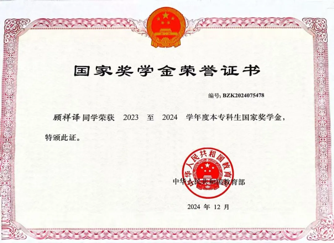 她秉持“立身百行,以学为基”的理念,严谨对待专业学习,课堂专注钻研、课后深耕细研,笔记批注详实、实操反复打磨,学业成绩稳居专业第一,先后斩获国家奖学金、国家励志奖学金,以扎实学识筑牢成长根基。