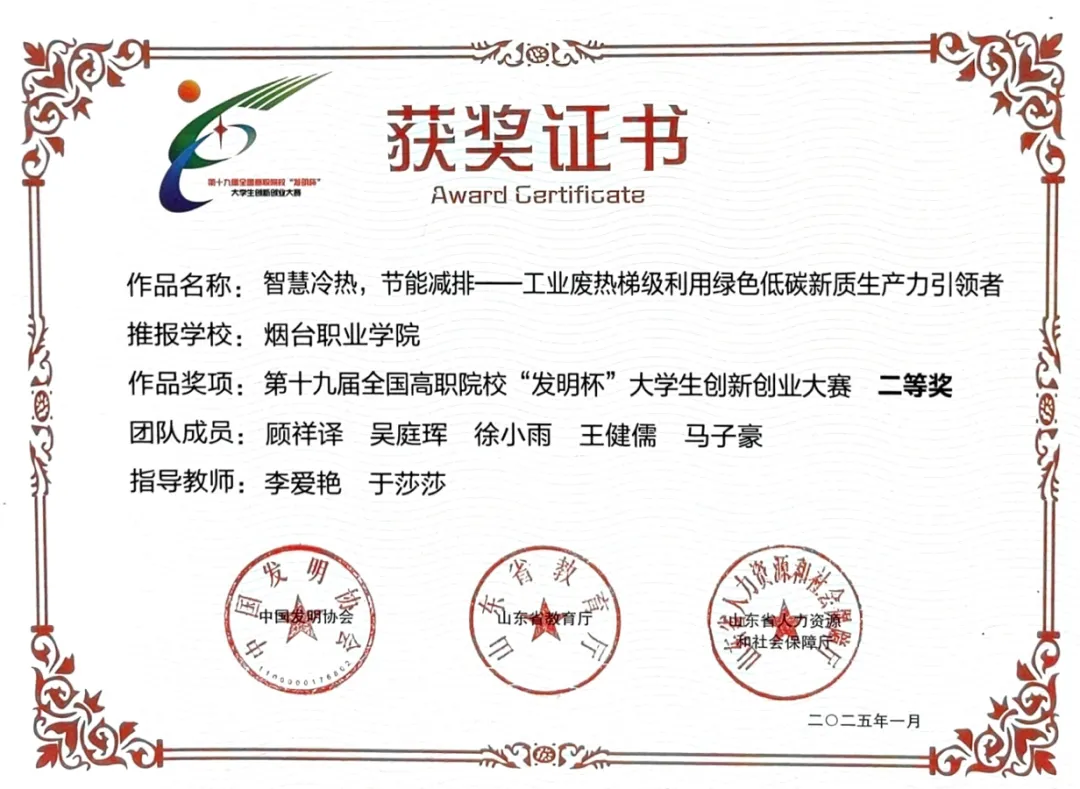创新领域,他成果丰硕、屡创佳绩——带领团队斩获第十四届“挑战杯”山东省大学生创业计划竞赛金奖、第十九届全国高职院校“发明杯”大学生创新创业大赛二等奖、2024“建行杯”山东省大学生创新大赛银奖、第十三届山东省大学生制冷空调创新设计大赛一等奖等多项重要奖项;以第一作者身份申请国家实用新型专利1项,展现出突出的创新思维与实践能力。