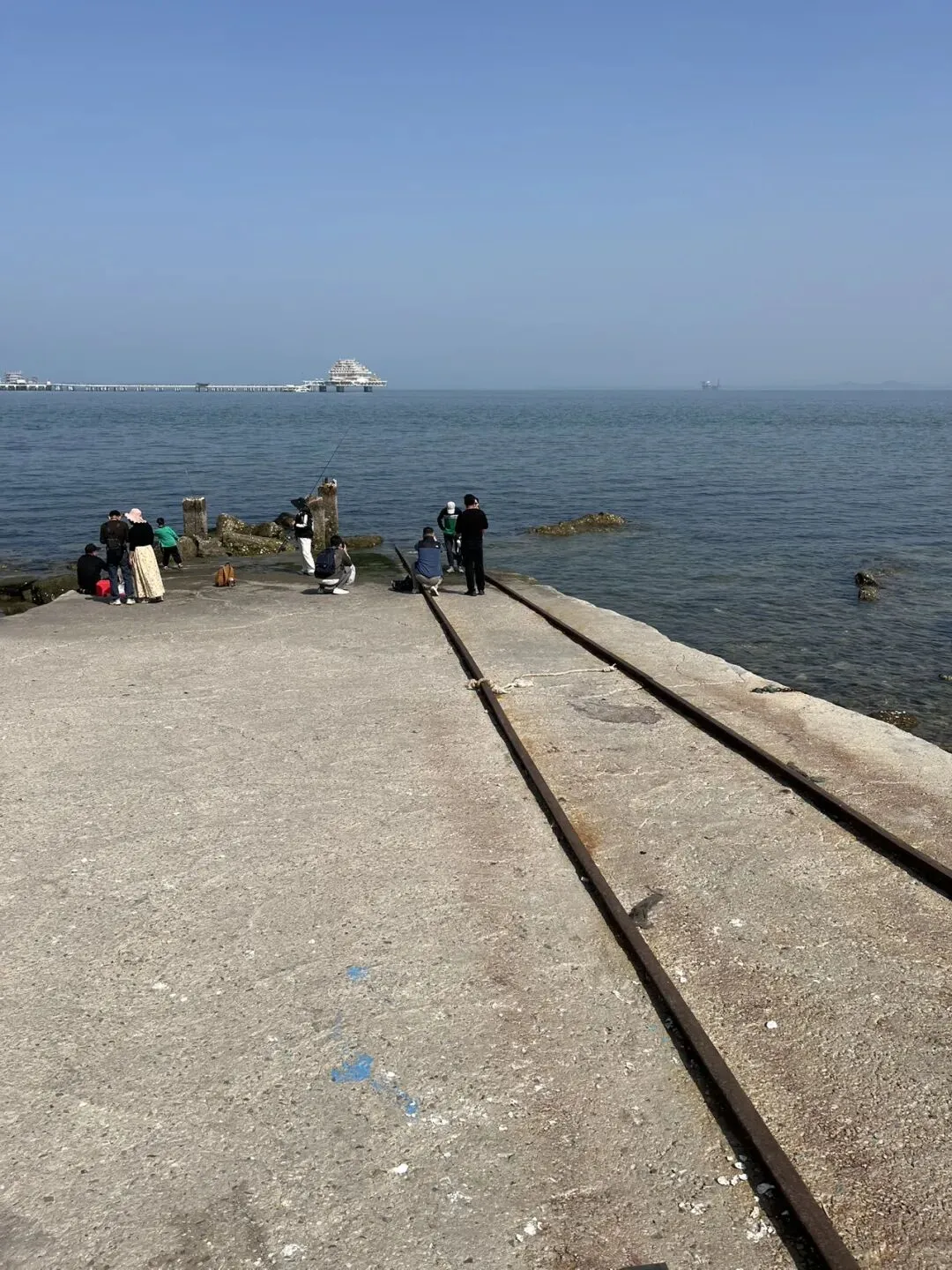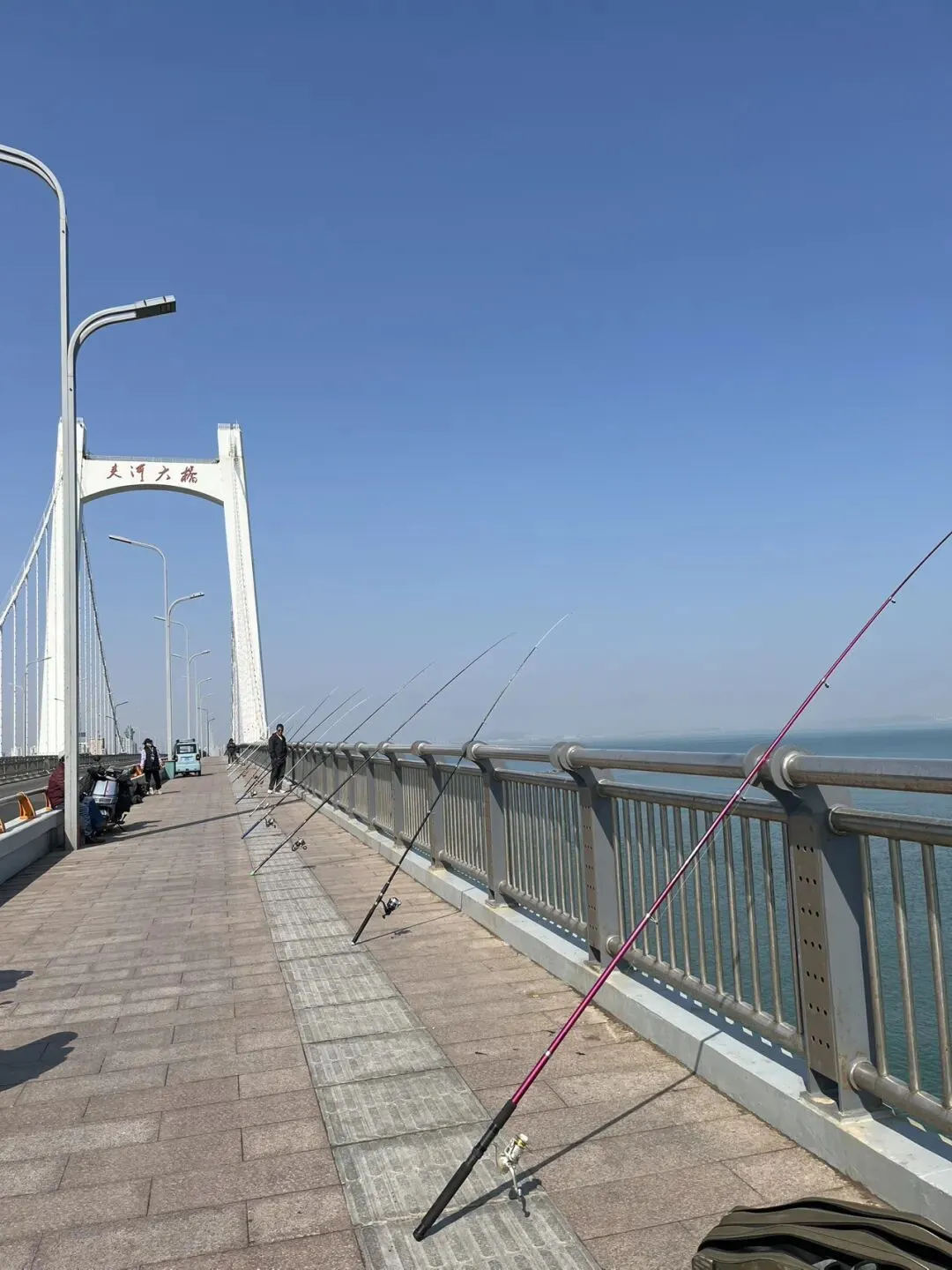 过夹河大桥,看到很多人支着海竿钓鱼,问了问说鱼线长七八十米到一百米