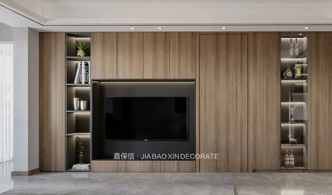 木饰面背景墙与灰色地砖的组合,铺就客厅高级又温馨的空间底色。电视墙纹理细腻,定制开放式储物柜和隐形门,兼具收纳和分隔空间的功能。玻璃门酒柜配隐藏灯带,让主人的珍藏成为艺术品。