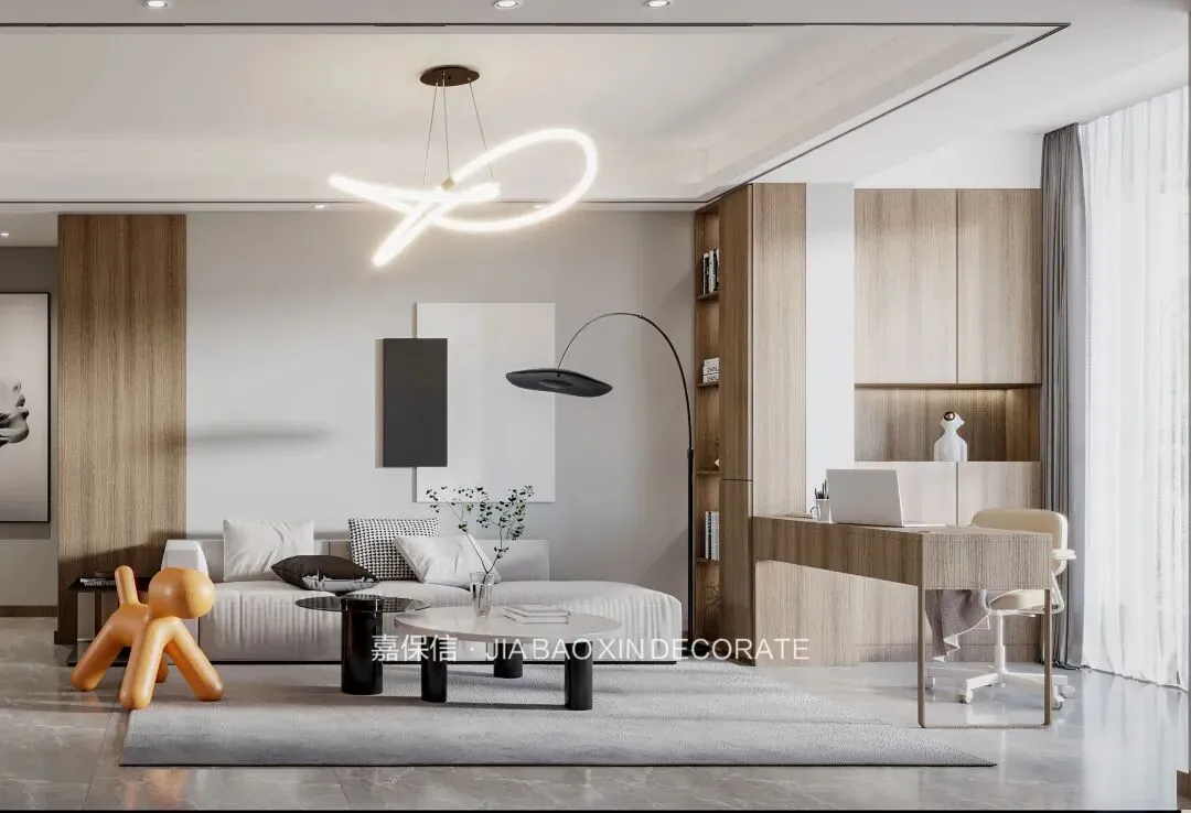 沙发墙则采用木饰面和灰色墙体的组合,搭配黑白相间的沙发、茶几,营造出温馨又富有层次的氛围。阳台打通后,定制通顶收纳柜和书桌,同时满足储物和办公两种需求。吊灯与筒灯、落地灯相结合,用光影巧妙划分区域。阳光透过纱帘洒进室内,在墙面、地面上留下错落的光影,成为室内流动的装饰。