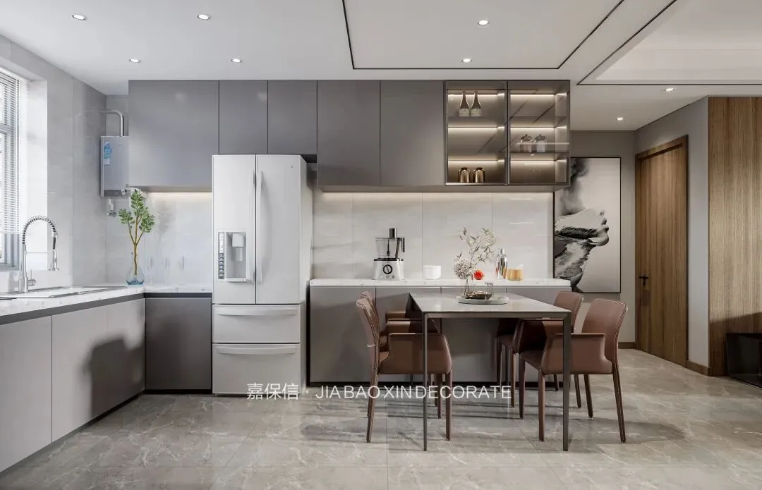 厨房与餐厅采用一体式布局,打破了空间的界限。灰色吊柜与地柜相辅相成,有序收纳日常用品。灰色大理石墙砖与地砖遥相呼应,纹理细腻清晰,形成统一的美感。