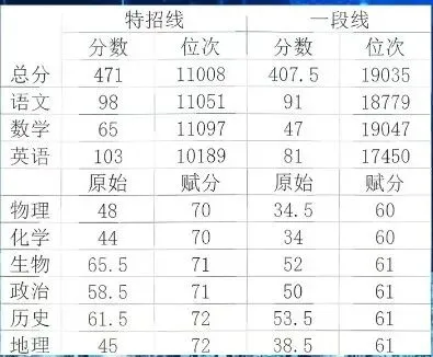 分数与市排名参考:471分,市排名11008;407.5分,市排名19035;特招线和一段线划线还是比较合理的。