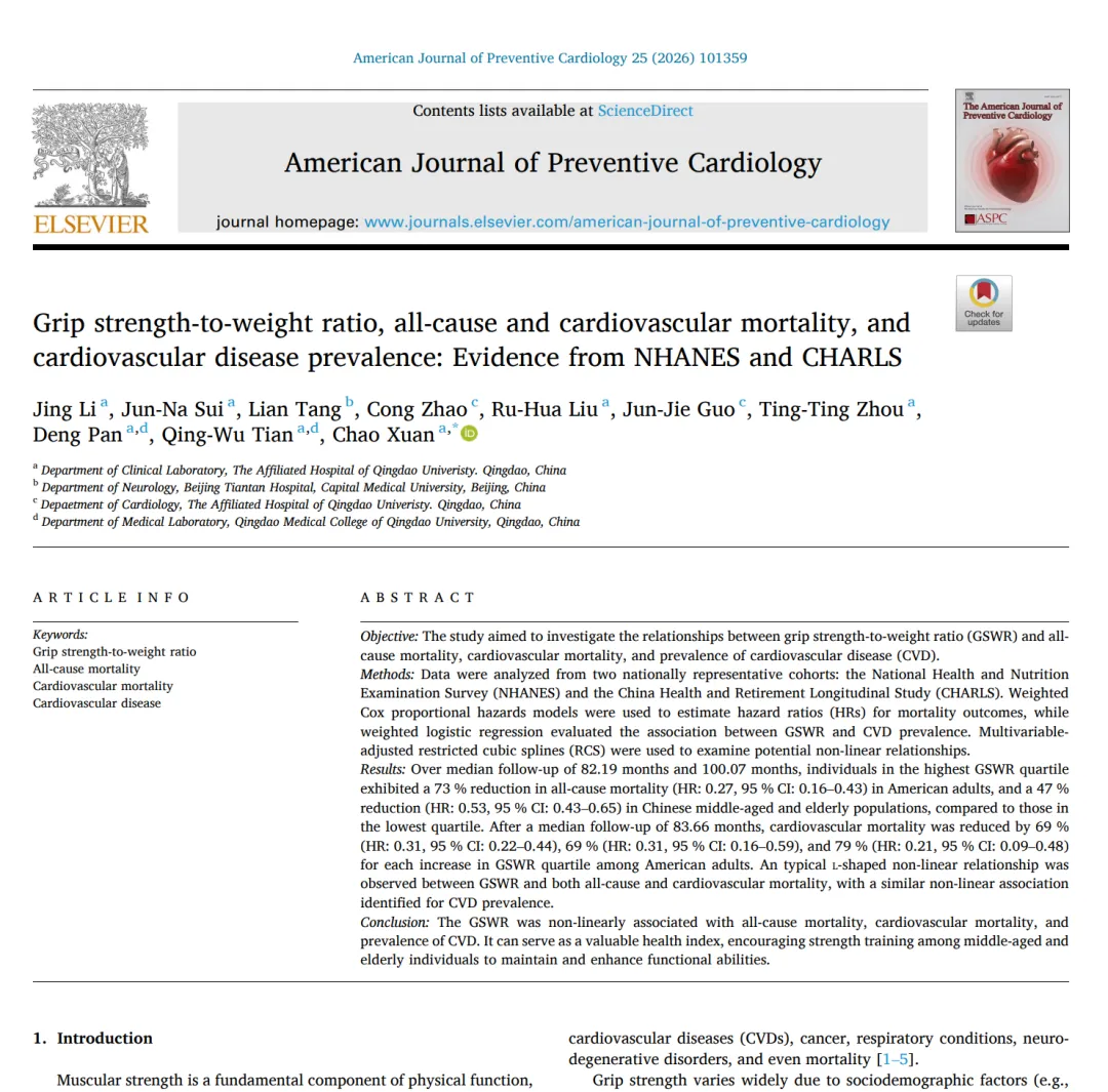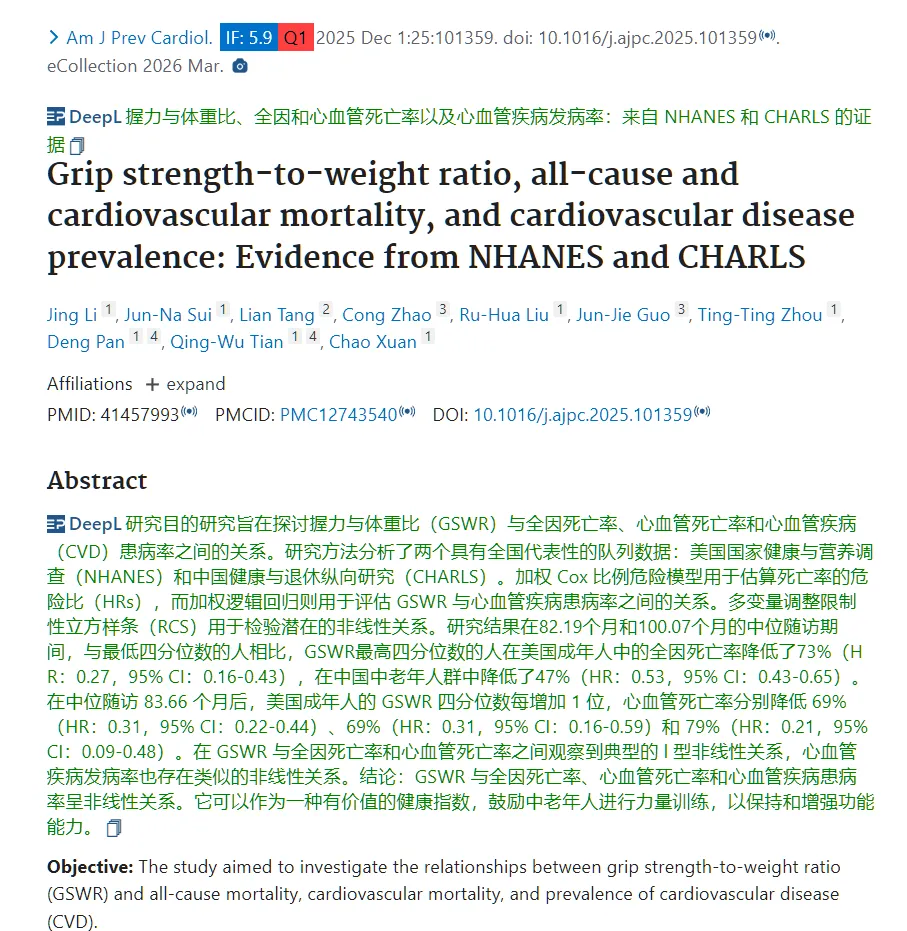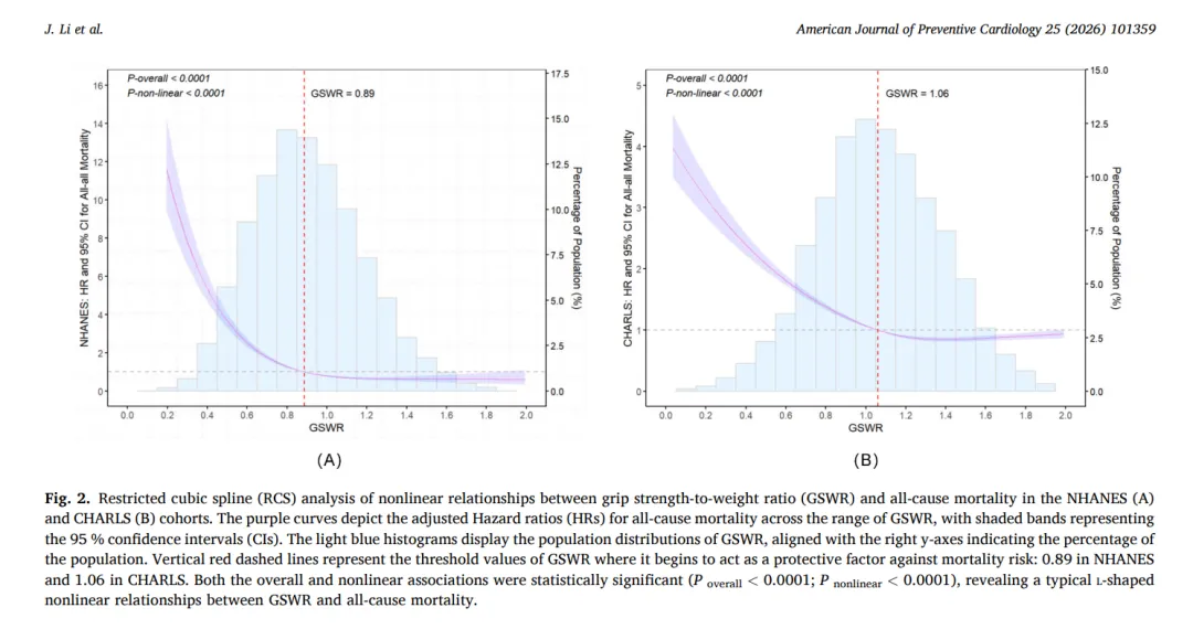 该指标可以作为一种有价值的健康指数,鼓励中老年人进行力量训练,以保持和增强功能能力,降低相关死亡风险。