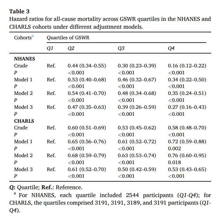 随访83.66个月后,每增加1个GSWR四分位数,美国成年人的心血管死亡率显著下降: