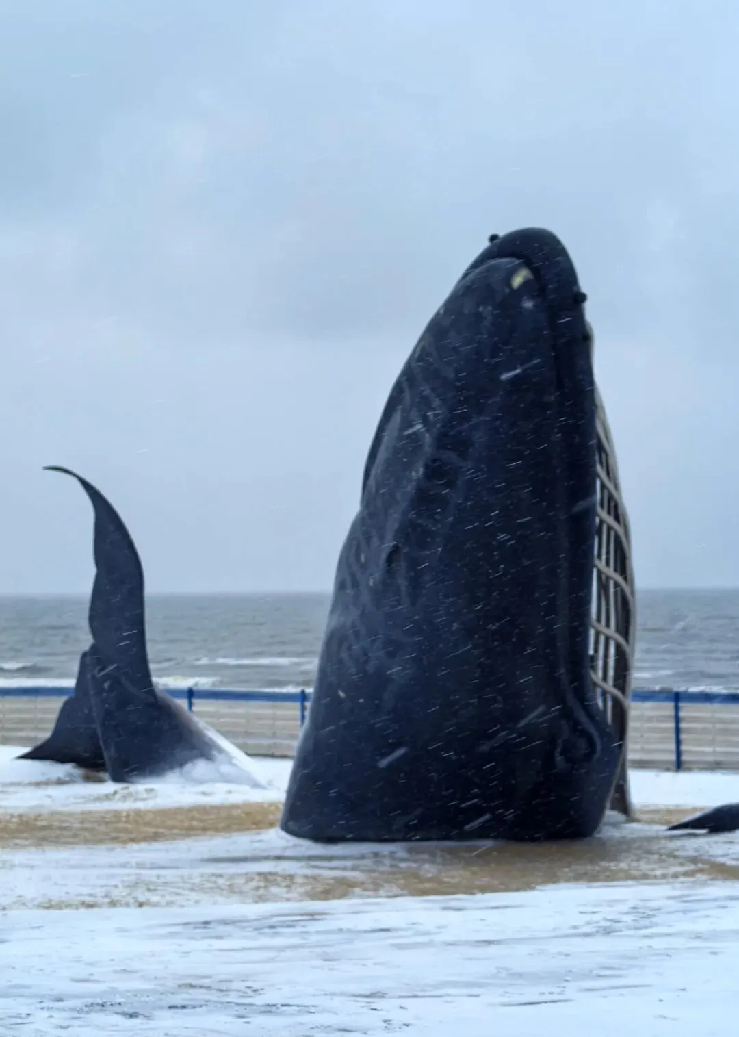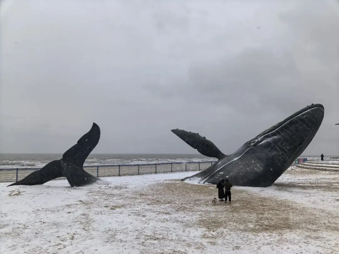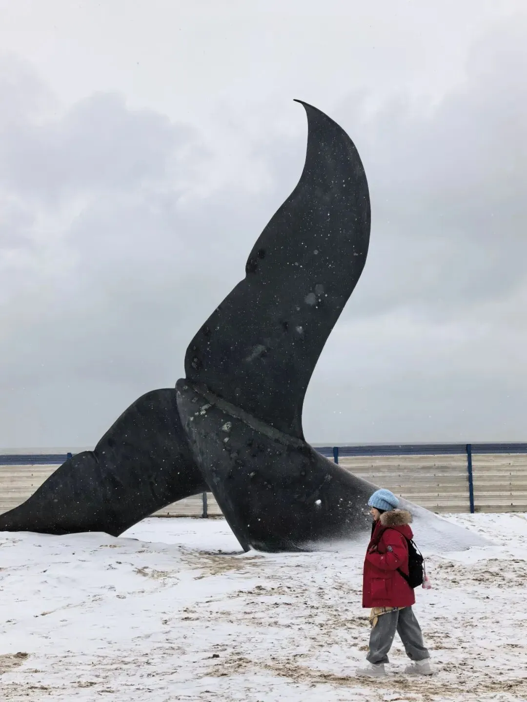 路边的雕塑也被雪晕染出别样韵味。海豚雕塑脊背覆雪,像披上轻盈白衫,阳光穿云而出时,雪粒在雕塑轮廓上闪着细碎的光。