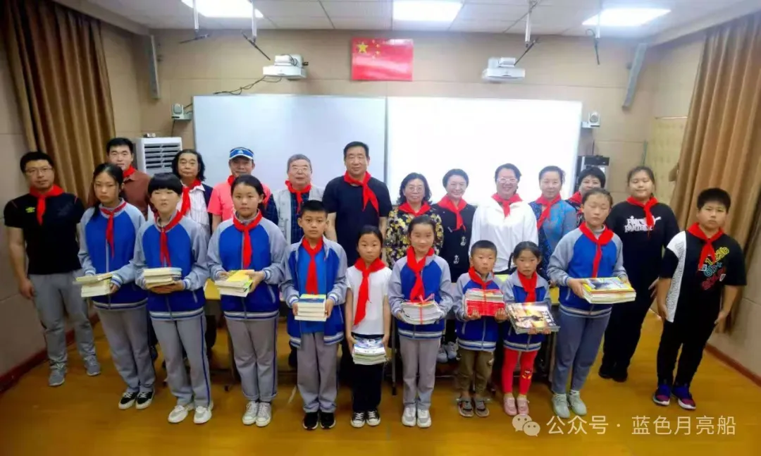 (图片为海歌带领蓝月亮文学社作家到田横岛小学赠书活动现场)
