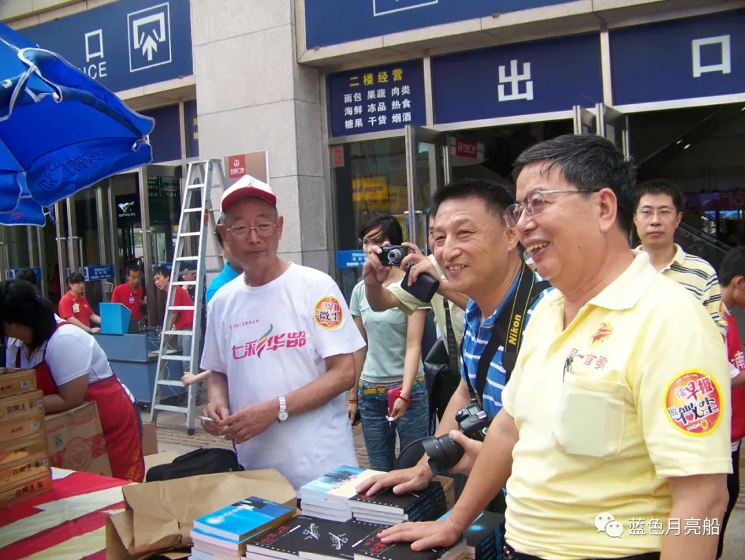 (此图为海歌带领青岛蓝月亮文学社作家在台东三路义卖赠书)