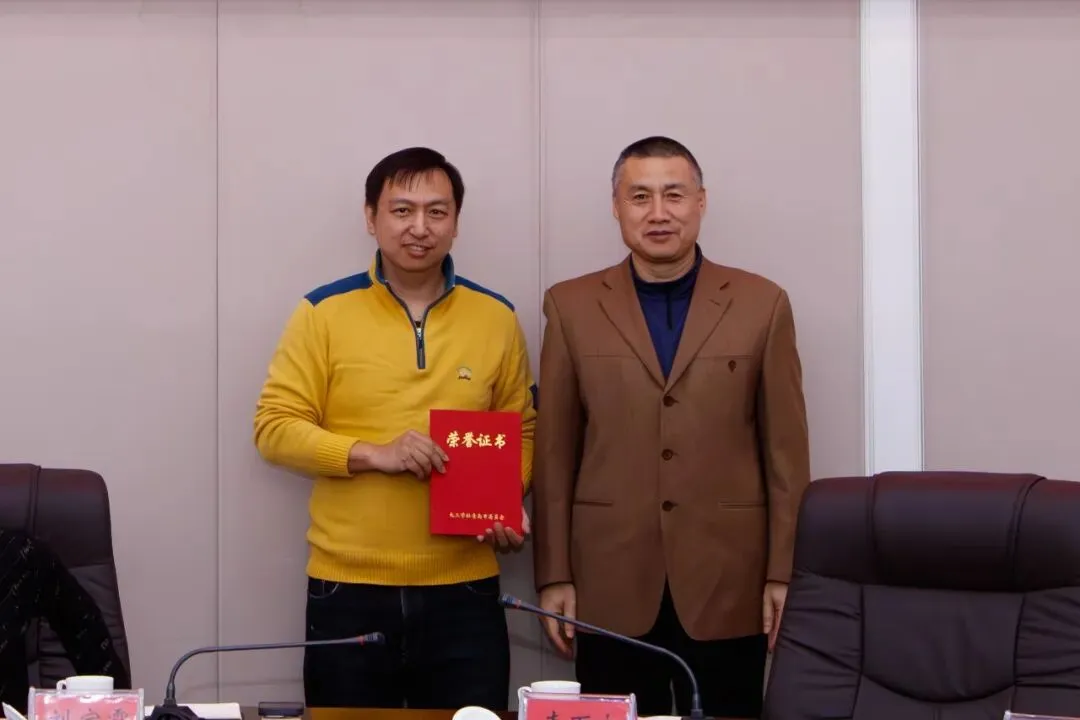 九三学社青岛市委员会组织处处长朱松君向机关直属委员会委员王圣颁发“优秀社务工作者”荣誉证书,旨在表彰王圣同志在社务工作中所展现出的高度责任感、扎实工作作风和突出贡献,激励广大社员以先进为榜样,积极投身社务工作,为机关直属委员会各项事业的发展贡献力量。