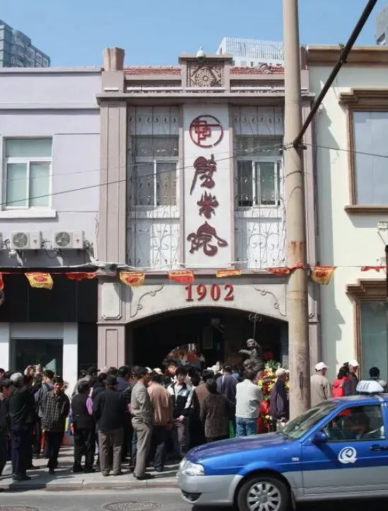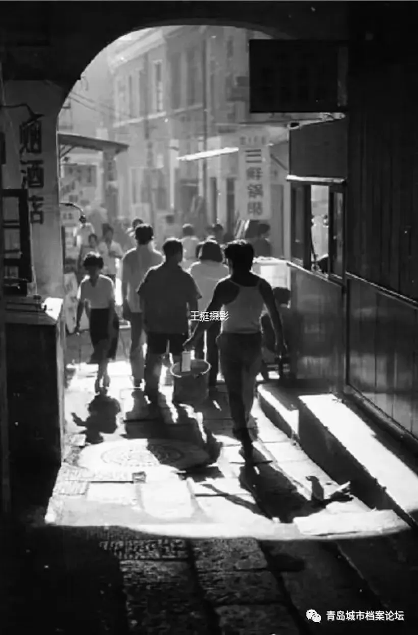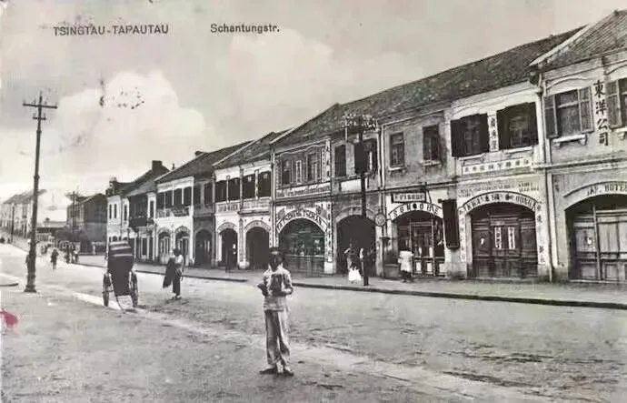 德占青岛时期的劈柴院中山路出入口(右数第4个门洞,网络照片)劈柴院最早是由江苏商人按江浙民居结合青岛里院特色建造的,狭窄的巷道、比肩而立的小楼、江南水乡的木质大门、房间的布局等等,无一不体现着江浙民居的特色。也正是根据该街区的建筑风格特点,劈柴院即取名为江宁路。从20世纪20年代中期开始,劈柴院逐渐成为青岛商业、餐饮和娱乐最为集中的地方,为青岛最早的商业街区,也是青岛民俗文化的兴隆地。正街的北京路出入口和知名的顺兴楼一街之隔,中山路出入口与百年老字号春和楼也是近在咫尺,正是占据了这地利之便,正街才逐渐形成了酒馆林立的餐饮一条街,白天熙熙攘攘,夜晚灯火通明。尽显市井风情。此般繁华的景象一直延续到20世纪的90年代。跟热闹的正街相比,西街则显尽小吃的恬淡。虽然店铺不多,却也品种齐全,糖果、花生、瓜子、栗子等炒货应有尽有,还有在各种食担上叫卖的小吃,如豆汁担,甜沫担,馄饨担,蔴花担,米糕担等等。有许多客家则是买了一份小吃,在书场或戏场边听边看边吃。劈柴院不仅是美食之地,也是青岛平民的娱乐场所。旧书店、文具店、茶社和娱乐场分布在其中的几个大院,有花鼓戏、相声、魔术、京剧、茂腔等各种演出。人们把劈柴院比做“北京天桥”,民间艺人在此聚集,包括以后成为大师的马三立,就曾在劈柴院“撂地”演出过(见下网络照片)——