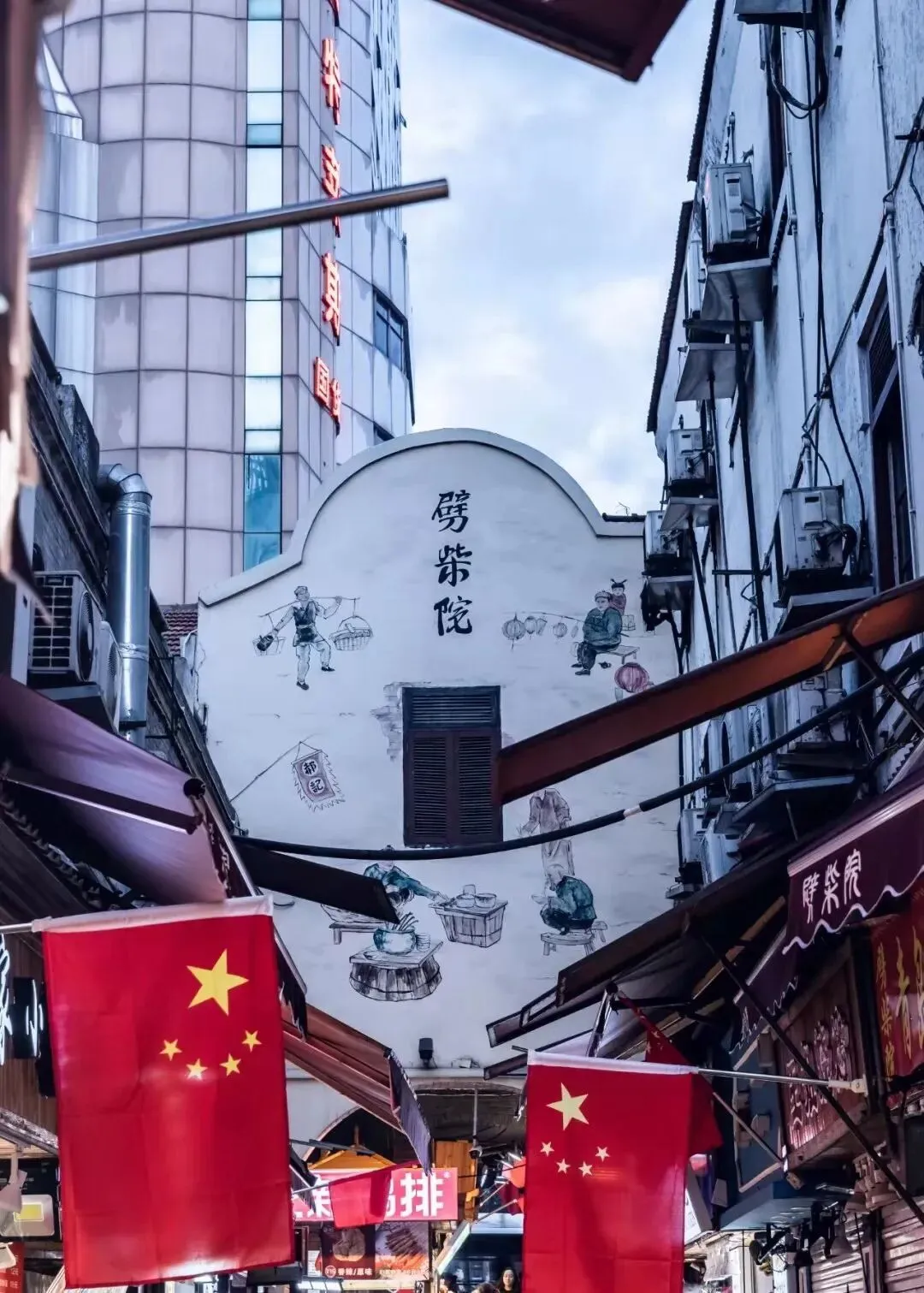 改造后的劈柴院中山路出入口人头攒动(网络照片)2007年后,劈柴院经过改造,按照原有业态修复,形成集传统风味小吃、曲艺文化娱乐、古韵风情购物、老街观光旅游为一体的民俗风情特色街。翻修改造后的劈柴院,保留了传统的青砖老街,成为中山路商圈的核心文旅地标。很多老市民称此地“可以接老街里的地气和福气”。改造后的劈柴院新貌(见以下网络照片)——