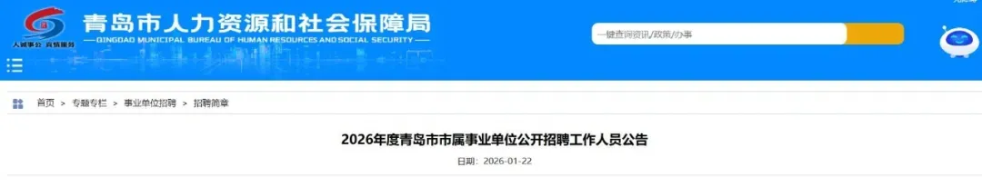 根据事业单位公开招聘有关规定,结合市属事业单位岗位空缺情况和工作需要,2026年度青岛市市属事业单位公开招聘工作人员144名(详见附件1《2026年度青岛市市属事业单位公开招聘工作人员岗位汇总表》,以下简称《岗位汇总表》),现将有关事项公告如下: