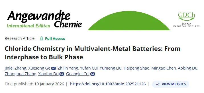 2026年01月19日,中国科学院青岛生物能源与过程研究所崔光磊、葛雪松、杜晓璠团队设计了一种胺-盐酸盐基镁电解质,旨在形成有利界面相和氯化物基通道。该研究提出了一种配体交换策略,以促进界面快速去溶剂化以及阴极材料内部的Mg²⁺快速扩散。详细分析表明,含氯阴极电解质界面相(CEI)和含MgH₂的阳极电解质界面相(SEI)的形成有助于促进溶剂化Mg²⁺的去溶剂化过程。此外,氯化物基通道将Mg²⁺在Mo₆S₈中的扩散能垒从0.712 eV显著降低至0.517 eV,证明了快速Mg²⁺扩散动力学。因此,Mo₆S₈基全电池在1 C倍率下循环100次后容量保持率超过80%。进一步地,该策略对无氯电解质也展现出兼容性,由活化Mo₆S₈阴极构成的全电池可提供超过90 mA h g⁻¹的高比容量,并在900小时循环后保持80.3%的容量。该策略同样适用于有机正极和Mo₆S₈基钙金属全电池。该研究提出了一种普适性的策略,可用于设计高能量密度可充电多价金属电池体系。