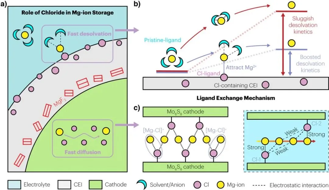 图1| 氯化物在Mg离子存储中的作用。a) 氯化物在Mg离子存储中作用的示意图。b) Mg离子在含氯CEI和无氯CEI上去溶剂化过程的示意图。c) Mg离子在正极材料内部氯基通道中扩散过程的示意图。