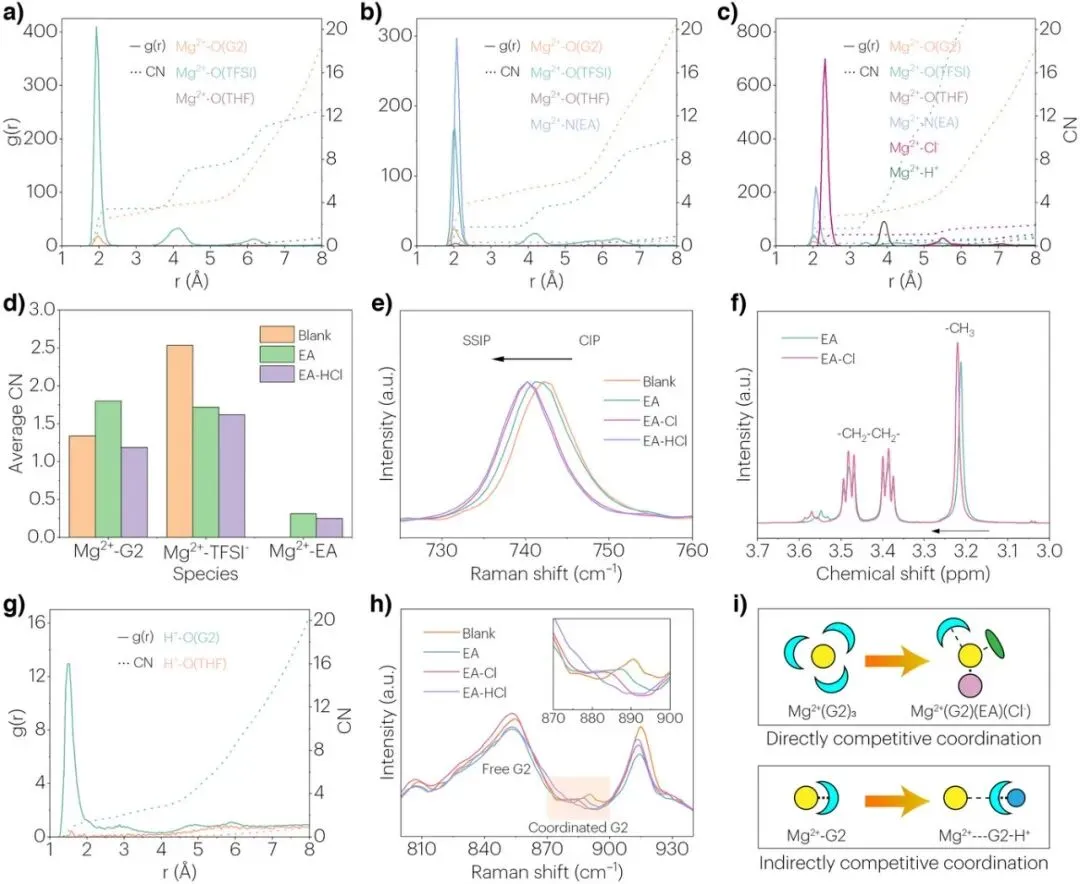 图2| 电解质中活性物种与配位环境的演变。a–c) Blank a)、EA b) 和EA-HCl c) 电解质的径向分布函数 g(r) 和配位数 (CN)。d) 不同电解质中Mg离子对G2/TFSI⁻/EA的平均CN。e) 不同电解质的拉曼光谱。f) EA和EA-Cl电解质¹H NMR谱的对比。g) EA-HCl电解质的径向分布函数 g(r) 和CN。h) 不同电解质的拉曼光谱。i) EA-HCl添加剂对传统Mg电解质影响的示意图。