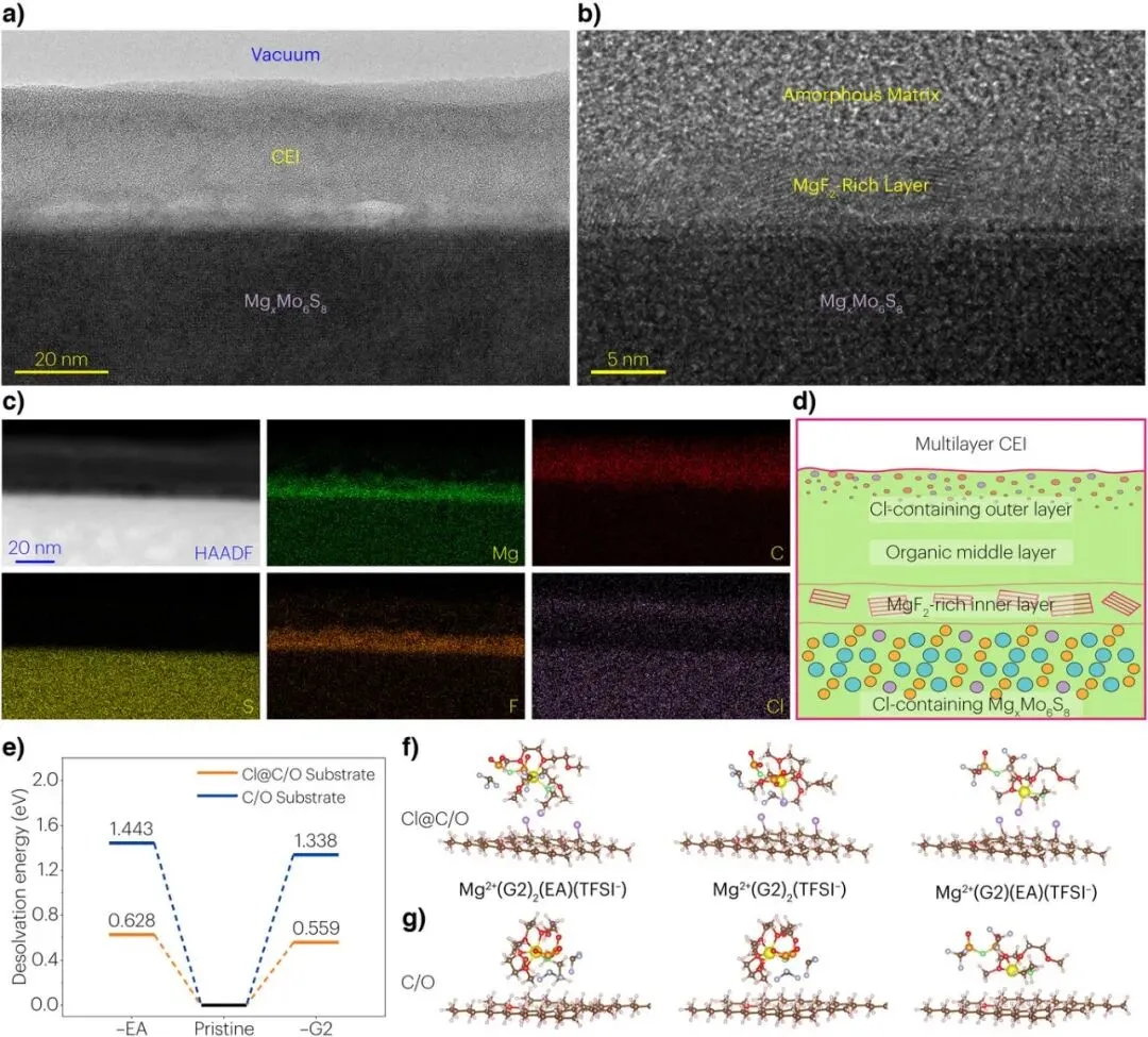 图4| 刚柔耦合多层阴极电解质界面相。a, b) 高分辨透射电子显微镜图像。c) 能量色散谱。d) 多层阴极电解质界面相示意图。e-g) [Mg²⁺(G2)₂(EA)(TFSI⁻)]物种在含氯有机CEI(Cl@C/O, f)和常规有机CEI(C/O, g)上的去溶剂化能。