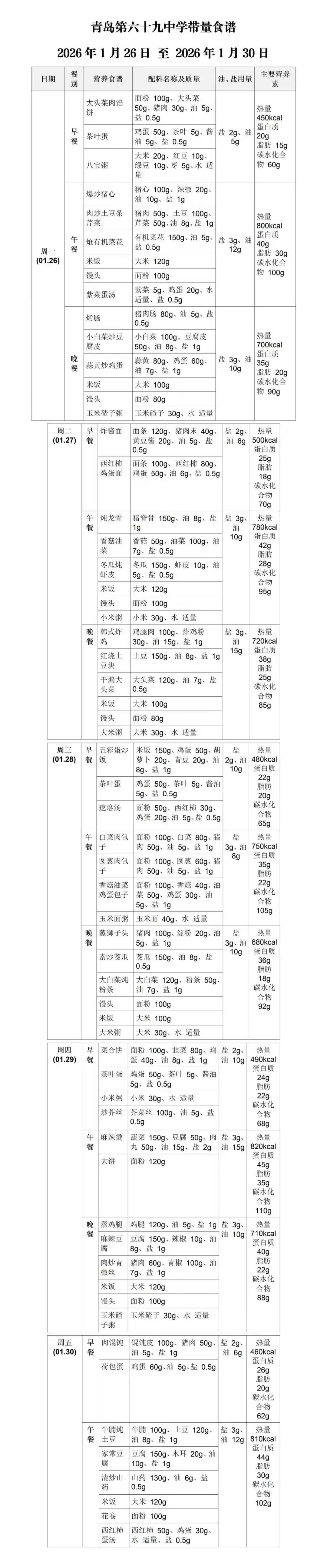 >【带量食谱】青岛第六十九中2025至2026学年度第一学期第二十二周带量食谱