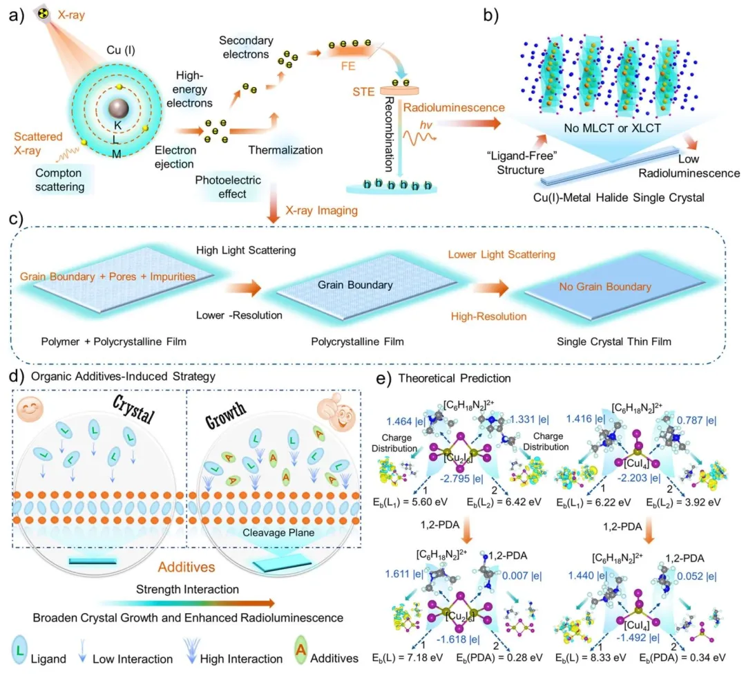 Scheme 1图1a、X射线闪烁机制及其能量转移过程示意图;图1b、离子型混合铜(I)卤化物的无配体结构及低辐射发光示意图;图1c、成像分辨率与光散射关系示意图,光散射越高,分辨率越低;图1d 、有机添加剂增强相互作用并导致晶体广泛生长的示意图;图1e、DFT计算的有机配体与Cu(I)卤化物簇之间在有无1,2-PDA添加剂情况下的结合能和电荷转移信息。