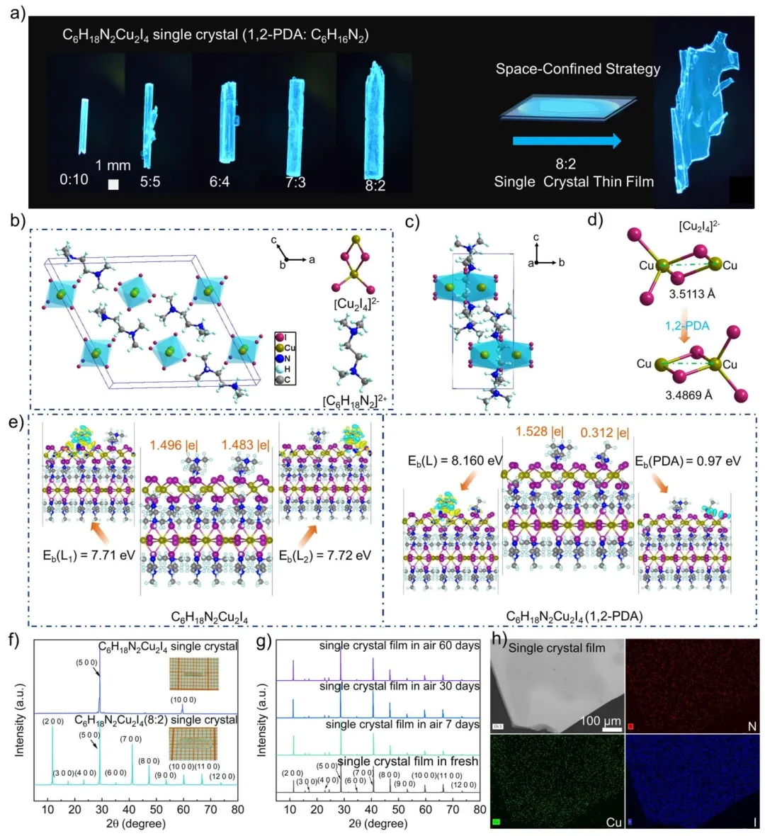 Figure 1图1、a) C6H18N2Cu2I4单晶在加入1,2-PDA前后的光学图像及其单晶薄膜在254 nm紫外光激发下的图像;b)和c) C6H18N2Cu2I4(8:2)的单晶结构;d) 加入1,2-PDA前后[Cu2I4]²⁻单元的结构;e) 在DFT/PBE-D3水平下,C6H18N2²⁺配体在C6H18N2Cu2I4(100)面上有无1,2-PDA添加剂时的计算吸附能和电荷转移量;f) C6H18N2Cu2I4和C6H18N2Cu2I4(8:2)在加入1,2-PDA前后的XRD图谱;g) C6H18N2Cu2I4(8:2) 晶体薄膜在空气中的稳定性;h) C6H18N2Cu2I4(8:2)单晶薄膜的SEM图像和EDS映射。