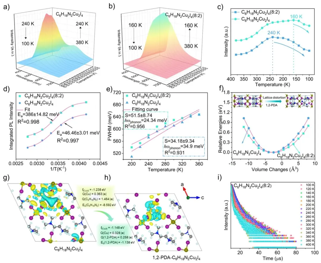 Figure 3图3、a)和b) C6H18N2Cu2I4和C6H18N2Cu2I4(8:2)晶体在100∼380K温度范围内的温度依赖性PL光谱;c) C6H18N2Cu2I4和C6H18N 2Cu2I4(8:2)晶体的PL峰值强度随温度的变化;d) C6H18N2Cu2I4和C6H18N2Cu2I4(8:2)晶体的积分PL强度随温度倒数变化;e) FWHM随温度变化的拟合结果;f) C6H18N2Cu2I4和C6H18N2Cu2I4(8:2)晶胞体积变化的势能曲线;g)和h) 在DFT/PBE-D3水平 下获得的C6H18N2Cu2I4和1,2-PDA-C6H18N2Cu2I4晶体的差分电荷密度图;i) C6H18N2Cu2I4(8:2)晶体的温度依赖性时间分辨PL(TRPL)光谱。