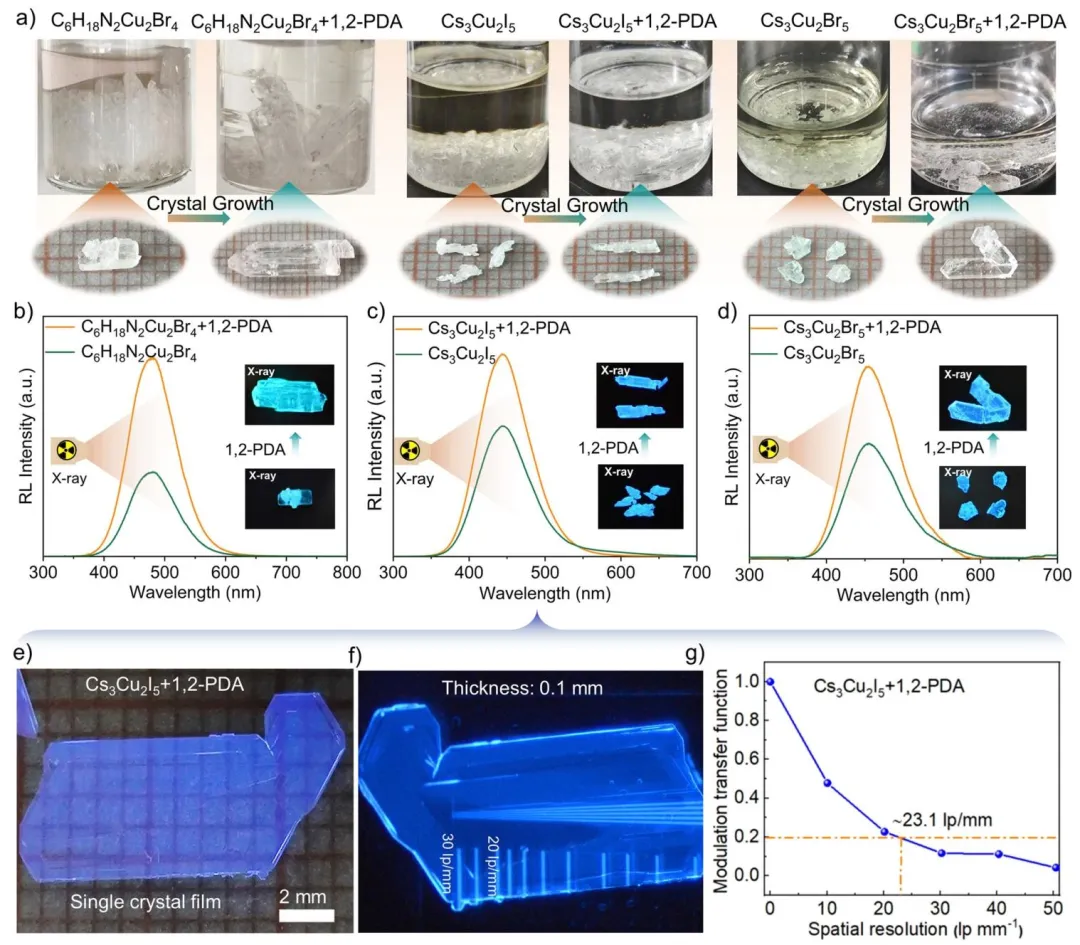 Figure 5图5、a) 加入1,2-PDA前后C6H18N2Cu2Br4、Cs3Cu2I5和Cs3Cu2Br5单晶的光学图像;b)-d) 加入1,2-PDA前后C6H18N2Cu2Br4、Cs3Cu2I5和Cs3Cu2Br5单晶的RL光谱;e) 加入1,2-PDA后的Cs3Cu2I5单晶薄膜在254 nm紫外光激发下的图像;f) Cs3Cu2I5单晶薄膜的X射线成像分辨率(剂量率:504 mGy s⁻¹,电压:50 kV,电流:200 µA);g) Cs3Cu2I5单晶薄膜的调制传递函数(MTF)曲线。
