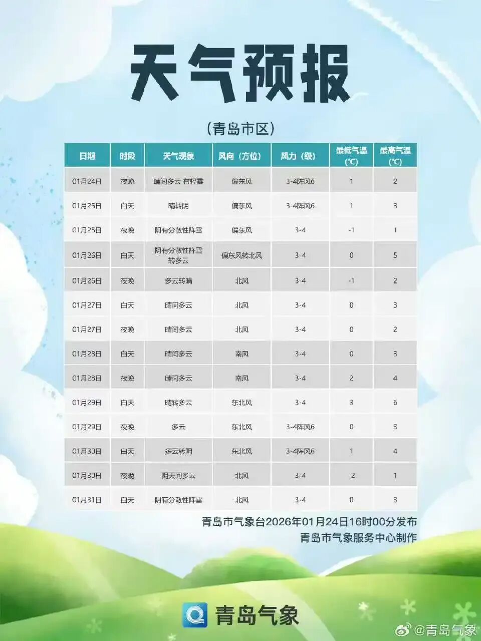 据@山东天气消息,24日白天到夜间,全省天气晴到少云。半岛地区北风 4 级阵风 5~6 级,其他地区南风转偏东风 3 级左右。夜间最低气温:东营、潍坊和半岛内陆地区-7℃左右,其他地区-5℃左右。最高气温:沿海地区 3℃左右,其他地区 6℃左右。
