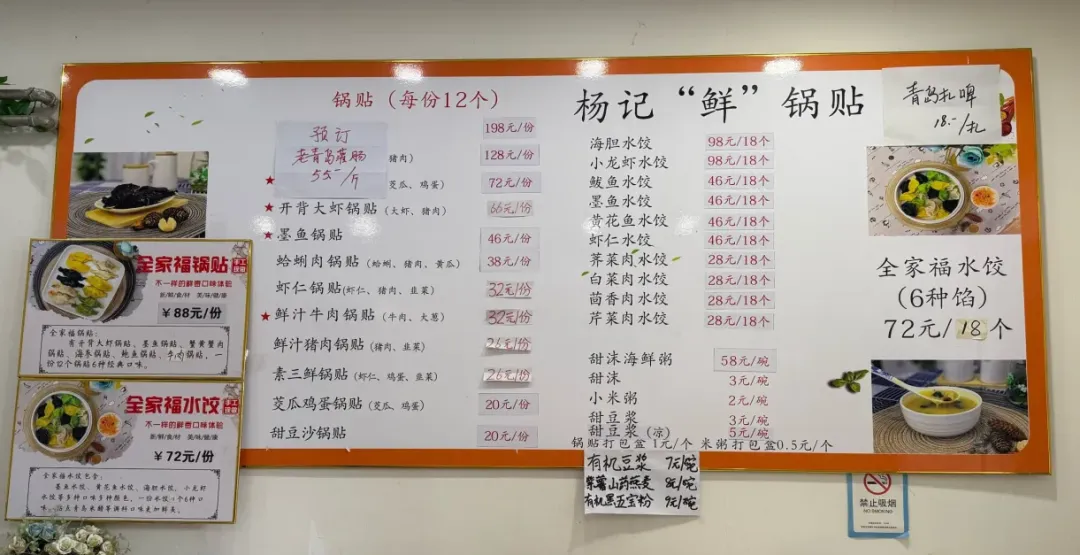 开背大虾锅贴、墨鱼锅贴、鲜汁牛肉锅贴、蛤蜊肉锅贴、鲍鱼锅贴、全家福水饺。