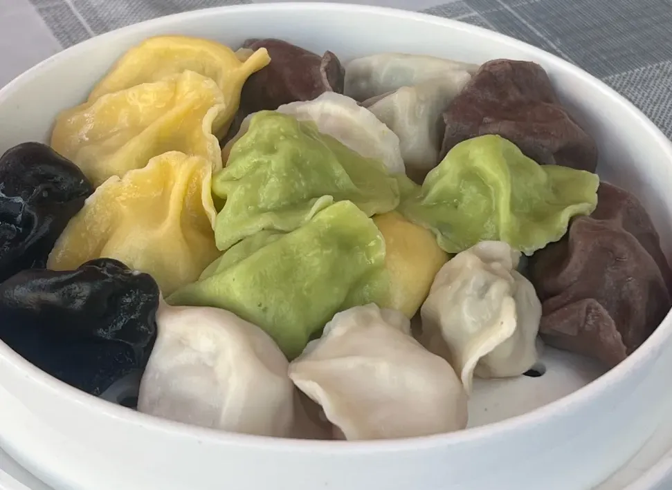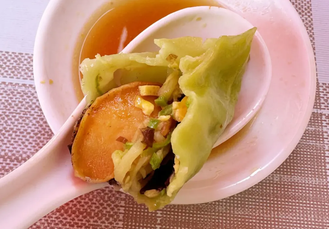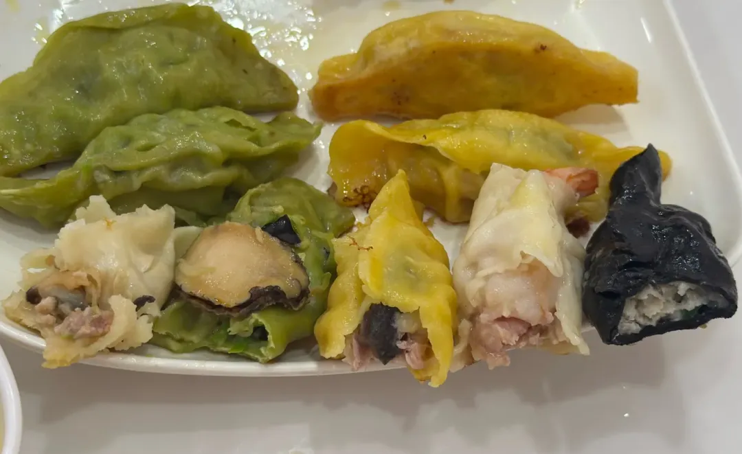 海胆馅的咬开是金黄的海胆黄裹着嫩韭菜,鲜得能把舌头化了,没有半点杂味,裹着软润的饺子皮,越嚼越鲜;小龙虾馅,粉白的虾肉裹在馅里,弹牙的脆嫩混着微微的辣,鲜得带劲,是夏天扒小龙虾的爽快感裹进了饺子里,一口就上头;墨鱼馅的更绝,墨色的内馅裹着 Q 弹的墨鱼肉,鲜得厚重,裹着面香越嚼越出味;虾仁馅是弹牙的鲜甜混着韭菜的脆,是最经典的鲜爽;黄花鱼馅嫩得像云朵,鱼泥裹着葱香,没有半点刺,软润得刚好;鲅鱼馅是青岛老味,鱼泥的鲜裹着姜香,是从小吃到大的熨帖。