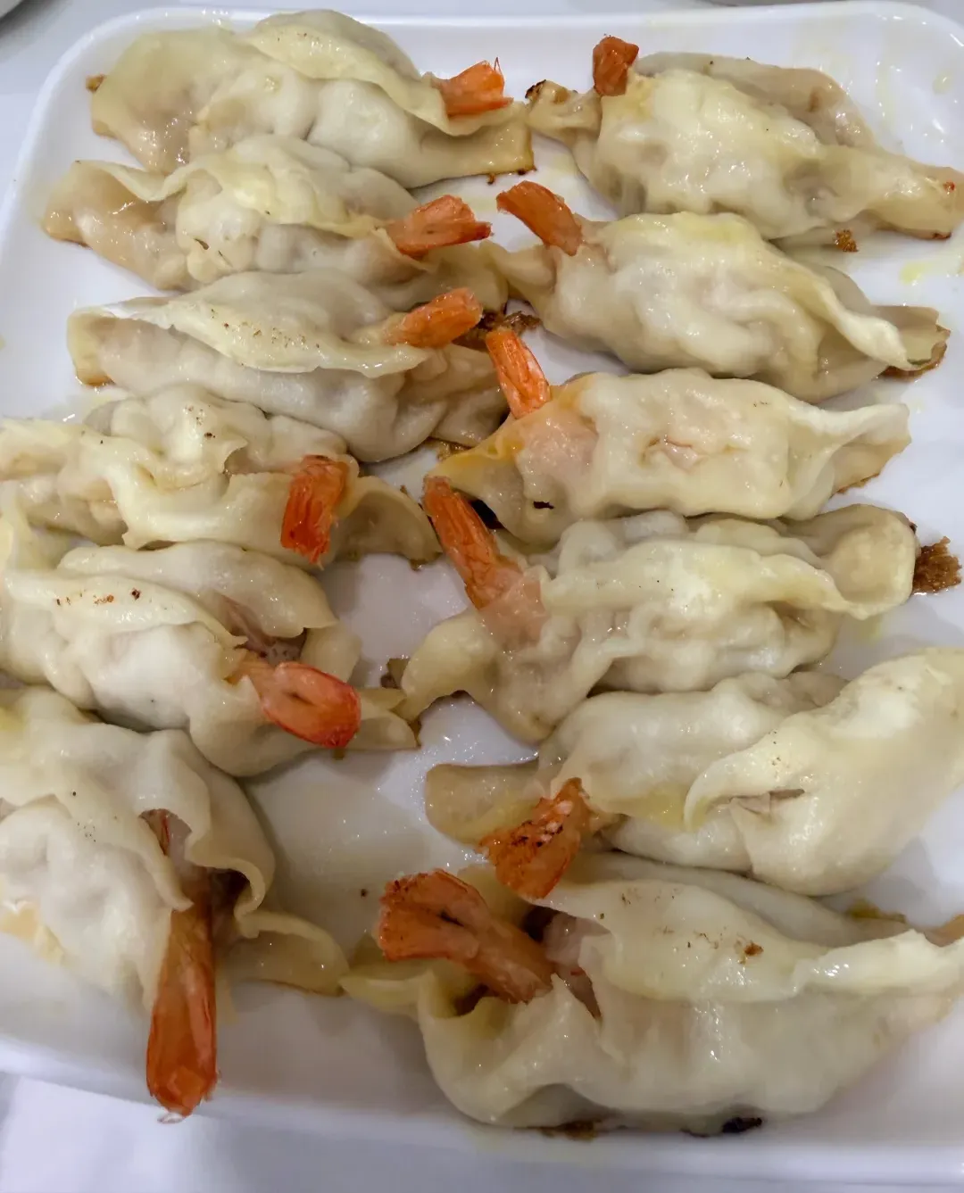 开背大虾锅贴:夹起一个锅贴,底儿脆得在盘子上 “咔哒” 响,咬开先是焦脆的外皮,裹着面香先炸开,紧接着是开背大虾的嫩弹,虾肉紧实得能尝到海味儿的甜,连虾线都处理得干干净净。再咬到肉馅,是肥瘦相间的猪肉,混着虾的鲜,鲜汁儿顺着嘴角往下淌,得赶紧吸一口。焦脆的底、软嫩的皮、弹嫩的虾、鲜美的馅裹在一块儿,香得想舔手指。