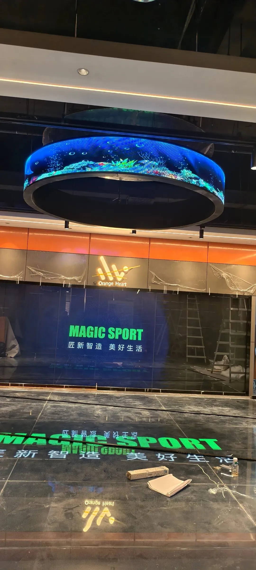 顶屏很重,我得和下面的师傅配合着,一点点把屏抬上去,对准钢结构的卡槽,再用螺丝固定好。冬天的烟台,室外冷,室内也没好到哪儿去,寒风从窗户缝里钻进来,冻得我的手都快没知觉了,只能时不时搓搓手,哈口气取暖。安装圆环屏的时候更麻烦,得围着天花板一点点调整位置,确保每一块屏都衔接顺畅,角度精准。阿梅在下面给我递工具、递水,时不时喊一句:“旺哥,小心点!”每次听到她的声音,我心里就多了一份底气。