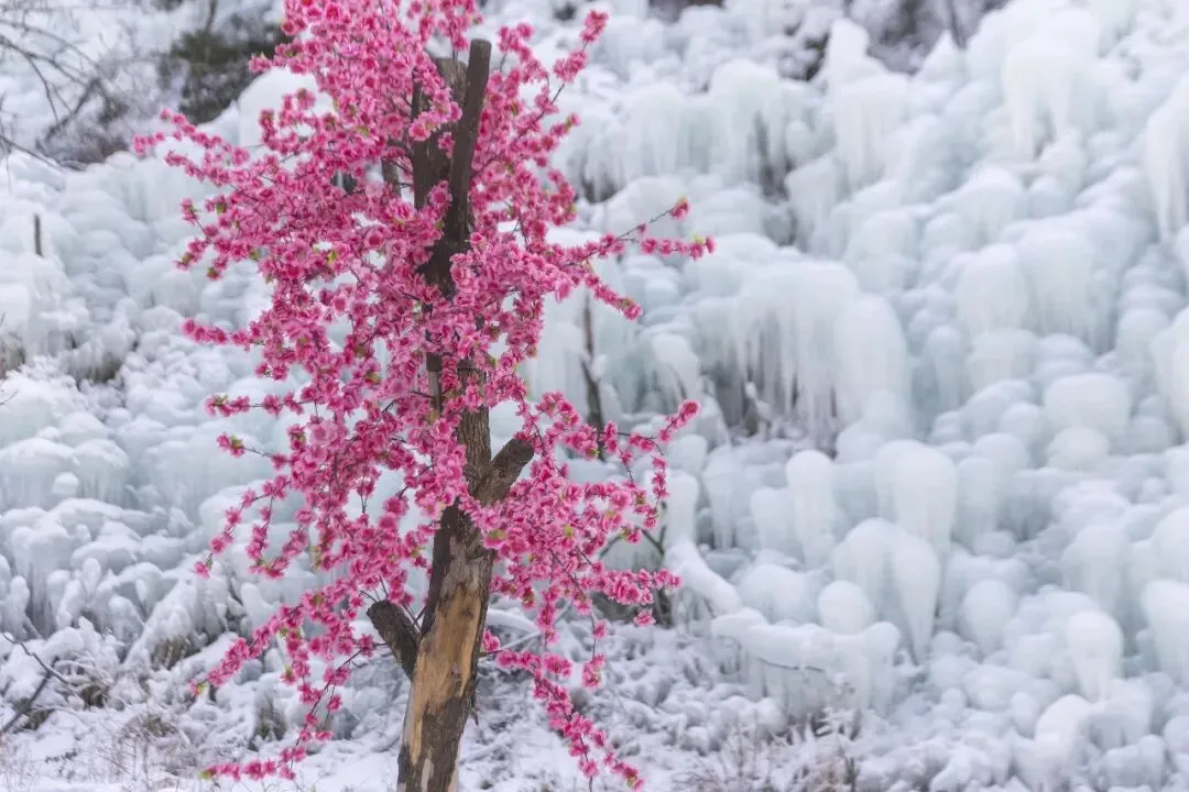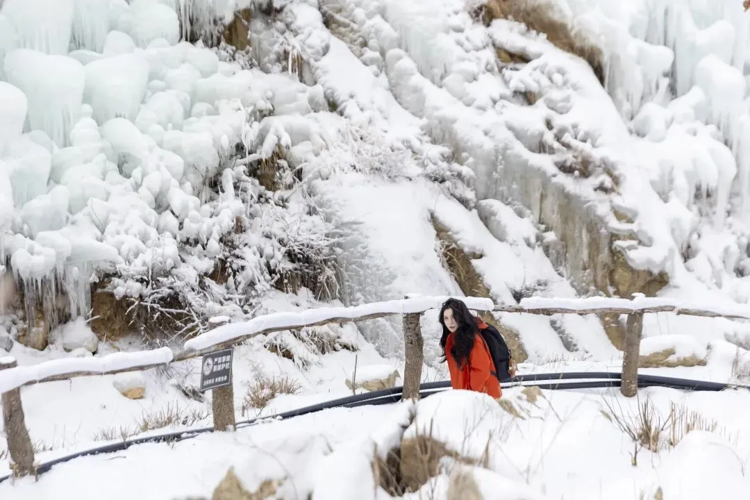 山涧间的冰瀑凝住了流水的灵动,巨型冰柱垂挂崖壁,如水晶雕琢的流苏,阳光掠过,折射出细碎的银光,恍若闯入冰雪秘境。