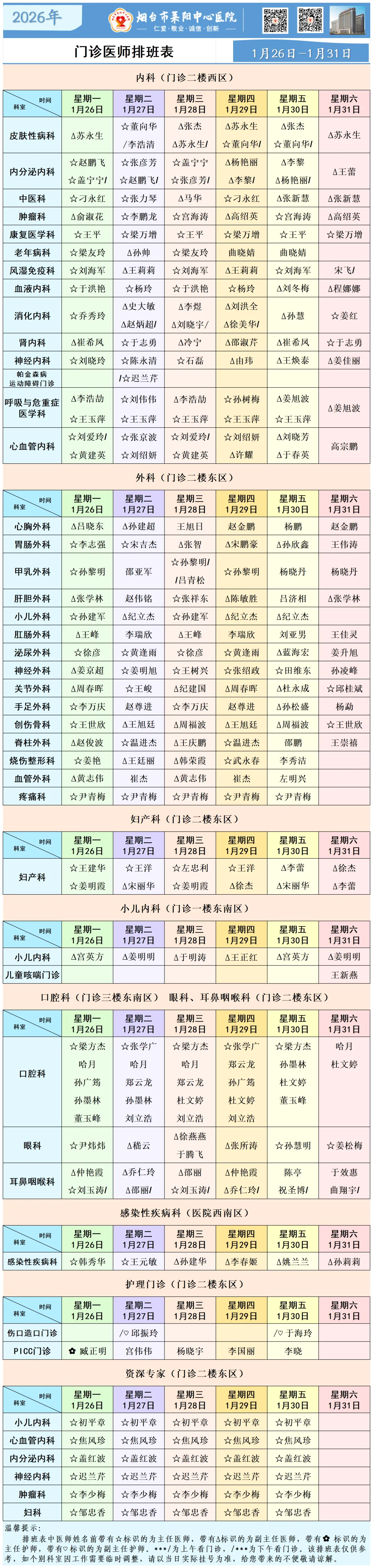 为了更好的方便市民朋友就诊,烟台市莱阳中心医院每周推出《门诊医师排班表》,市民朋友可根据需求查看医师坐诊时间,预约挂号,错峰就诊。就诊时请携带身份证、医保卡、就诊卡或电子健康卡。天气变化,注意增减衣物,戴好口罩,保持间隔距离。