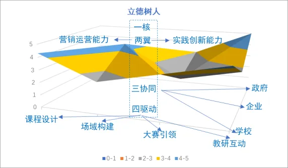 “一核两翼三协同四驱动”是指以立德树人作为人才培养目的关键一核(战略核心),将“市场营销运营能力”和“实践创新能力”作为人才培养目标的重要两翼(战略支柱),搭建政、校、企三协同育人平台(战略平台),实施“课程设计—场域构建—大赛引领—研教互动”四驱动的人才培养路径(战略措施)。