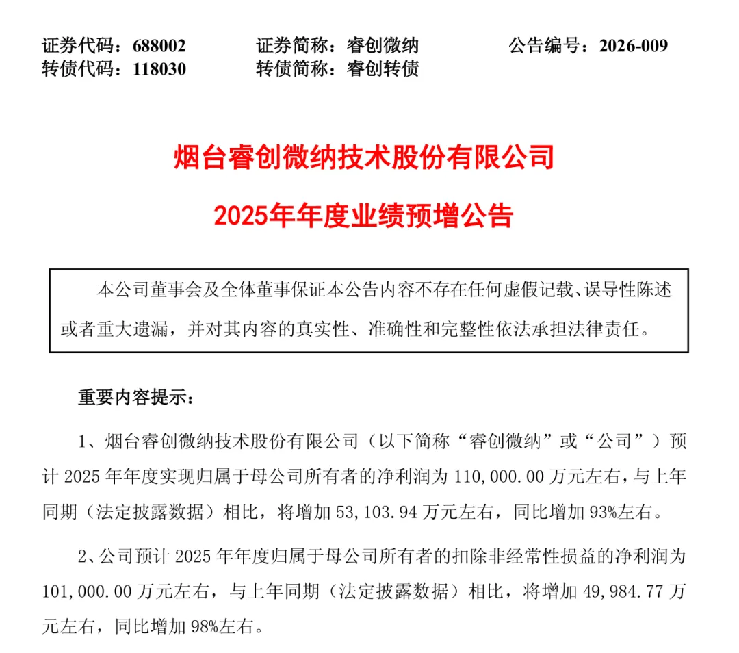 近日,烟台睿创微纳技术股份有限公司发布《2025年年度业绩预增公告》,预计2025年年度实现归属于母公司所有者的净利润为110,000.00万元左右,与上年同期(法定披露数据)相比,将增加53,103.94万元左右,同比增加93%左右。公司预计2025年年度归属于母公司所有者的扣除非经常性损益的净利润为101,000.00万元左右,与上年同期(法定披露数据)相比,将增加49,984.77万元左右,同比增加98%左右。烟台睿创微纳技术股份有限公司表示,报告期内,公司持续加大研发投入与新产品开发力度,积极开拓市场,扩大销售规模,保持订单充足和及时生产交付。全年营业收入突破60亿元,营业收入和净利润较上年同期实现显著增长。此前,《烟台睿创微纳技术股份有限公司2025年第三季度报告》显示,公司前三季度营业收入约40亿元,净利润约7亿元。按照预增公告全年营收突破60亿元计算,其第四季度营收将接近20亿元;按照预计2025年年度实现归属于母公司所有者的净利润为110,000.00万元左右计算,其第四季度净利润将超3亿元。企业官网介绍:睿创微纳(股票代码:688002)是全球领先的、专业从事专用集成电路、感知芯片与AI智能整机产品与解决方案研发的国家级高新技术企业。公司深耕红外、微波、激光等多维感知领域,掌握多光谱感知芯片研发的核心技术与AI智能算法深度研发等能力,为全球客户提供性能卓越的红外热成像、微波、激光芯片,应用终端及行业感知解决方案,以技术进步为客户创造增量价值。睿创微纳产品广泛应用于航空航天、卫星通讯、空间通讯、碳中和、低空经济、安防消防、汽车辅助驾驶、应急救援、消费电子、人工智能、医疗健康、科研创新等领域。在发布预增公告的第二天,烟台睿创微纳技术股份有限公司的股价涨停,收于123.31元/股。